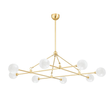 Glass globes cap slender baton-like aged brass arms, adorned with matching metal orbs, to create a streamlined modern design. The cloud etched glass creates a wispy cloud-like pattern inside the glass globe shades that fills with a warm glow when lit.