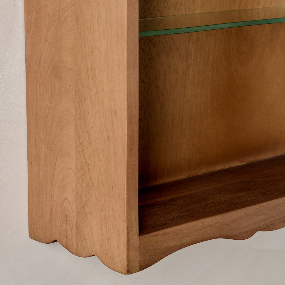 Keep flavor close at hand with our spice cabinet, crafted from rich mango wood and finished in a warm, antique-inspired hue. Timeless and elegant, this petite cabinet can be mounted on the wall or placed atop a kitchen counter, bringing fun and beauty to a functional item you'll reach for everyday. Designed with two adjustable glass shelves, it comes complete with hanging hardware for effortless display.