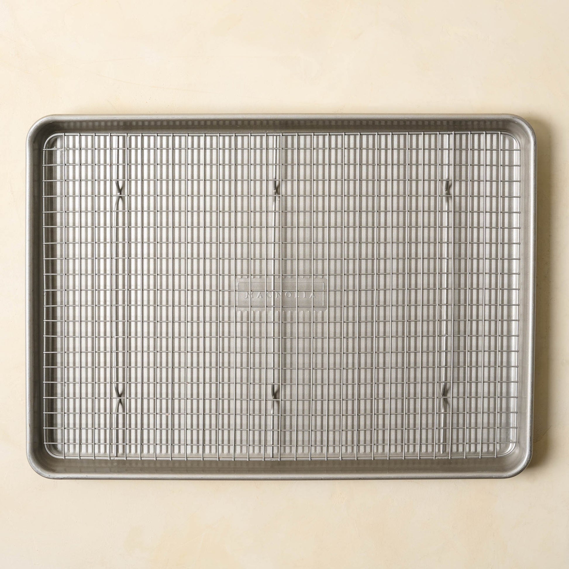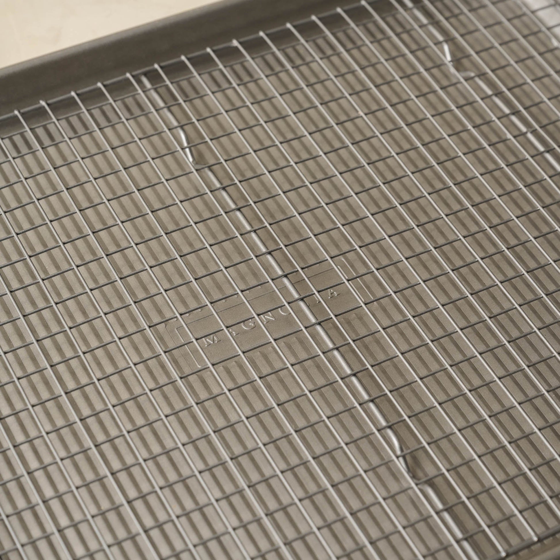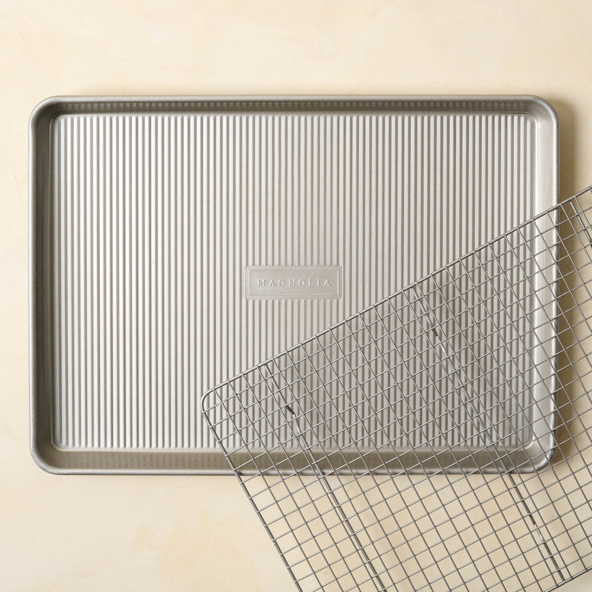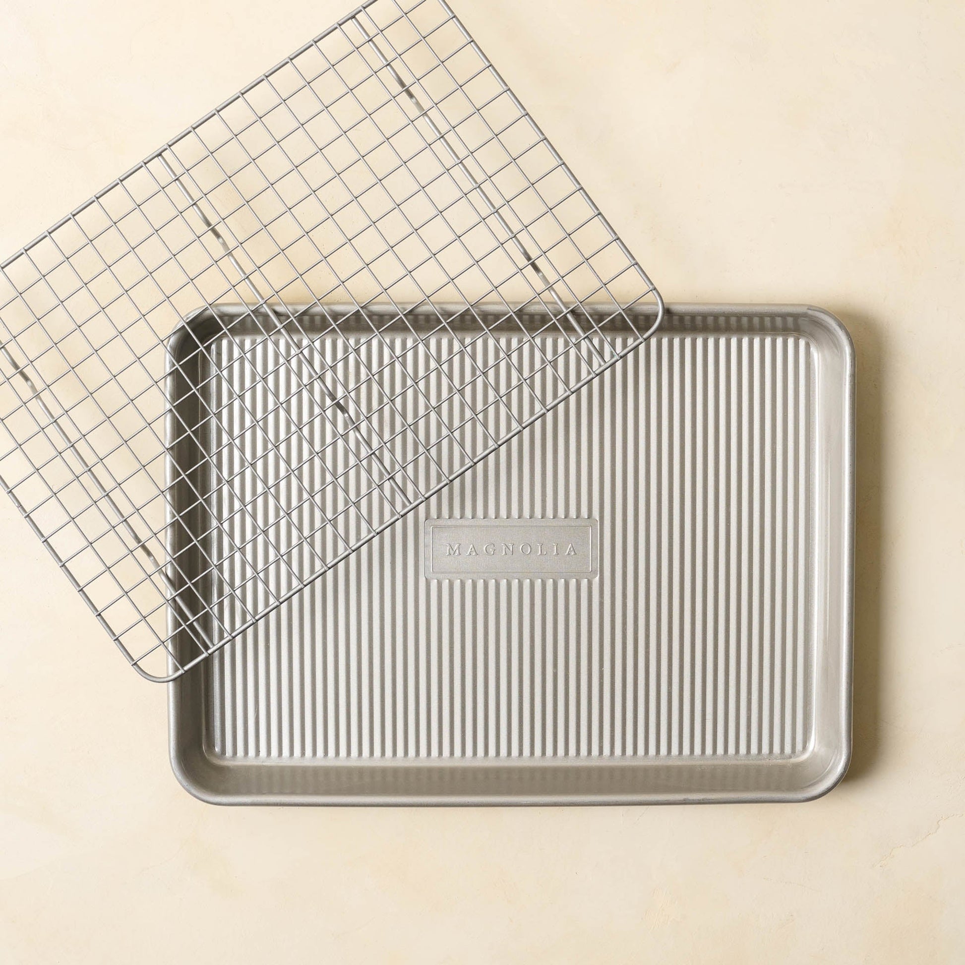 Cool cookies, glaze cakes, and bake to perfection with the Magnolia Baking Rack & Sheet Set. Available in half sheet and quarter sheet sizes, these sets include both a baking pan and an oven safe cooling rack with a steel cross wire design and six raised feet which promote uniform cooling and air flow. Made in the USA, this professional grade pans features a unique, ridged texture to facilitate even air circulation and heat distribution, as well as a safe, proprietary coating of non-stick silicone that allows your food to brown evenly and release easily.