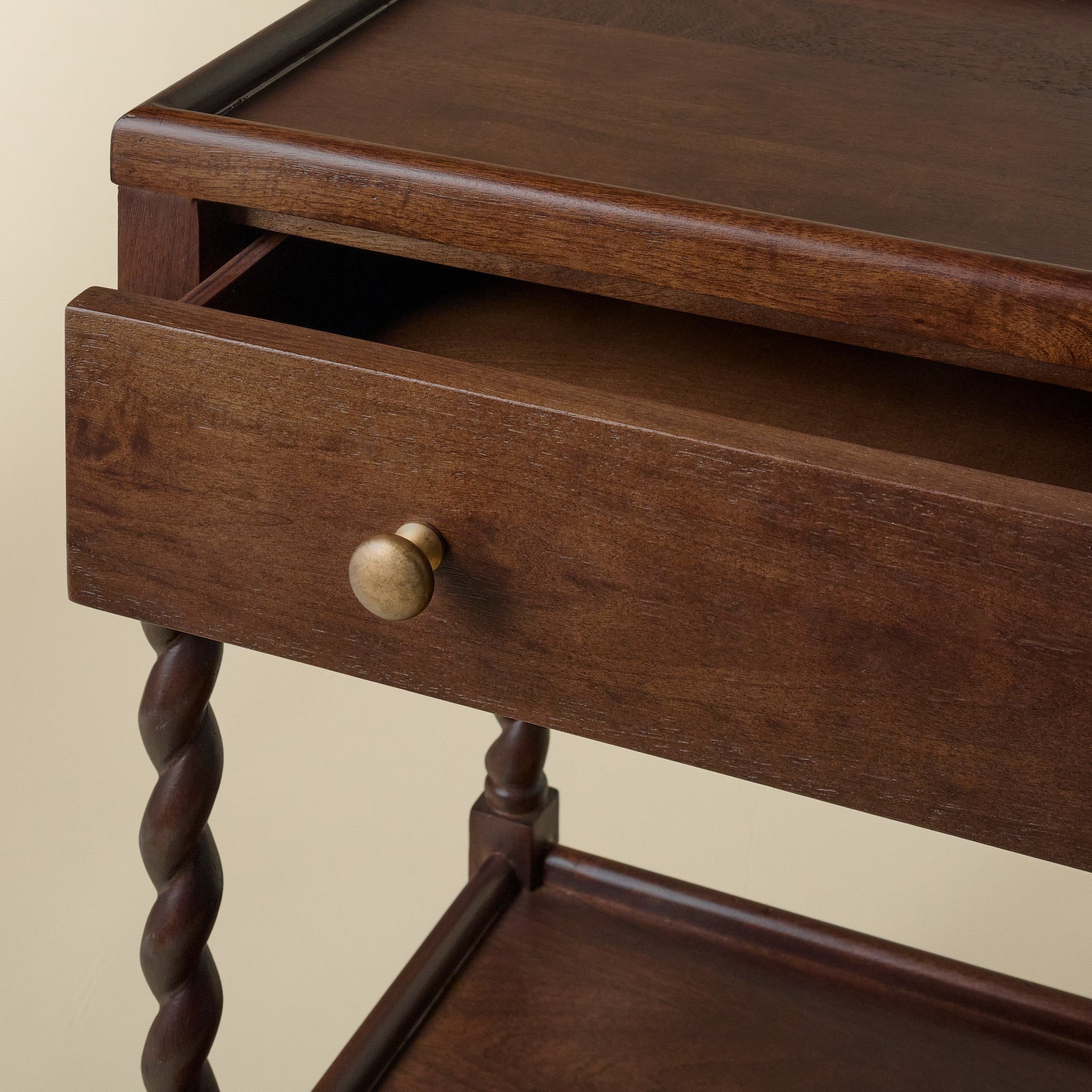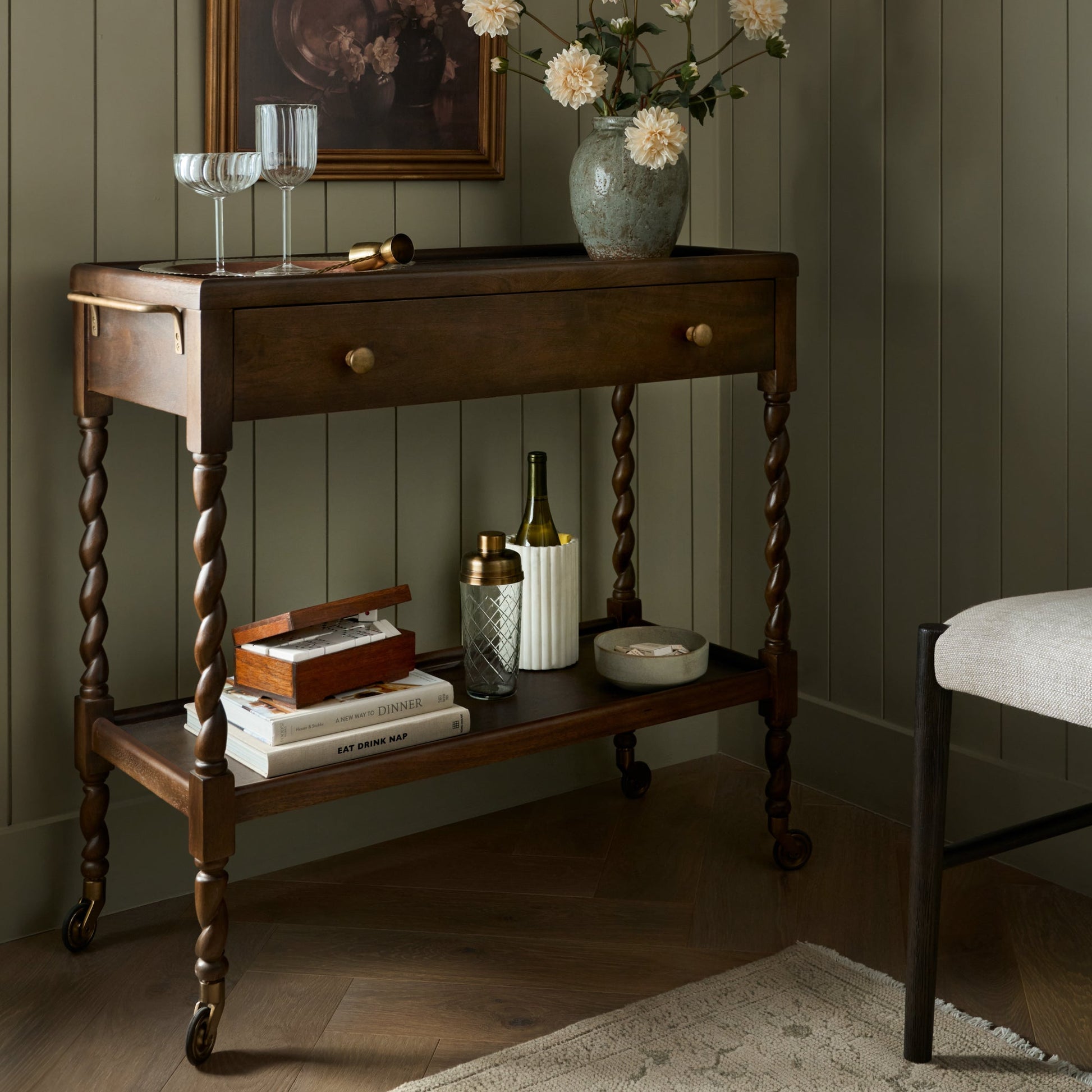 Cheers to effortless hosting! Elevate your entertaining with this timeless bar cart, crafted from mango wood and finished in a rich wood tone. Resting on casters for easy mobility, this cart features the new Barley Twist design, a convenient drawer for storage, and ample space for preparing beverages in refined fashion.