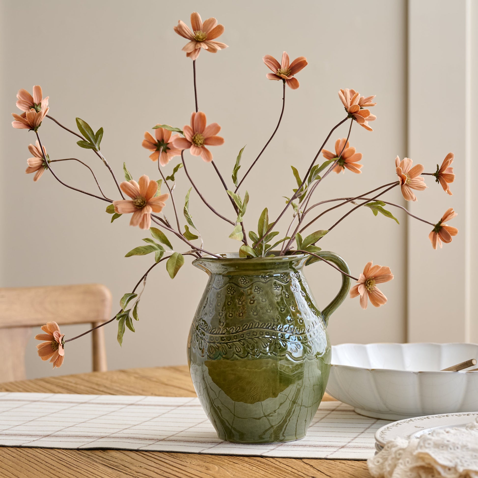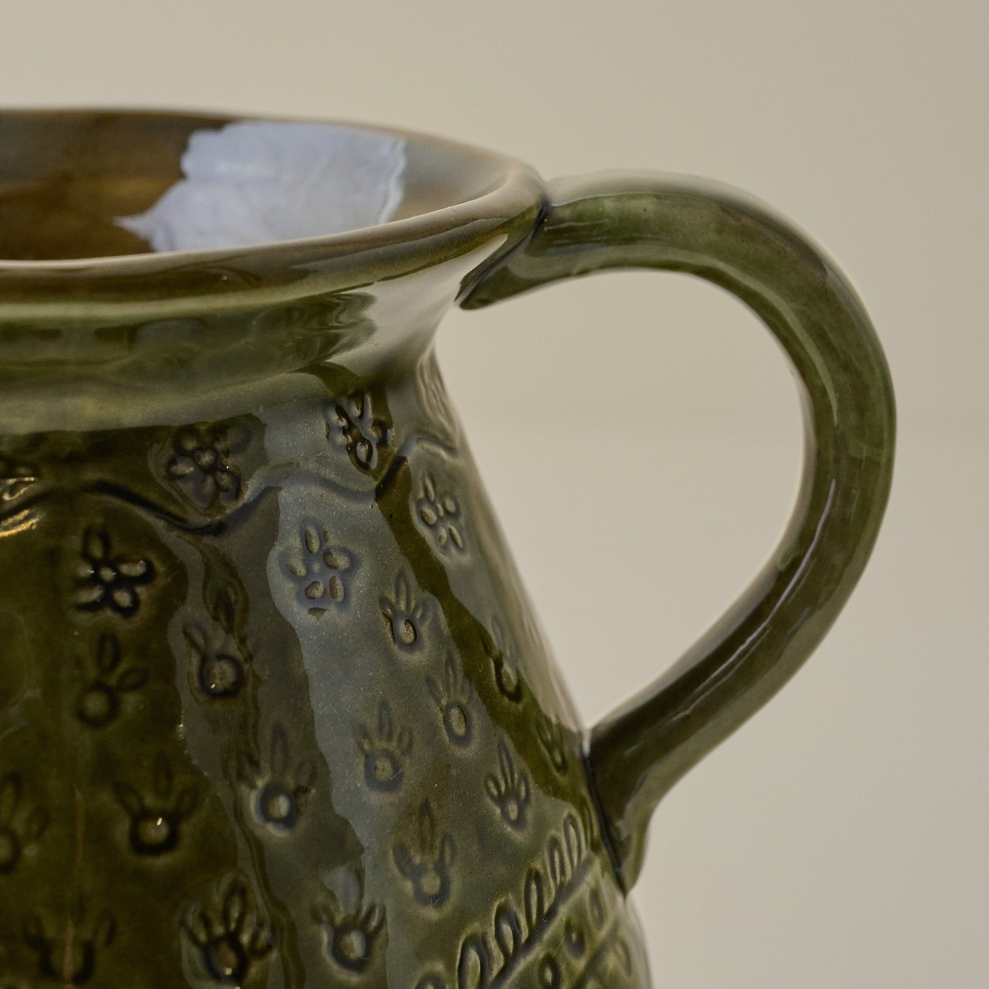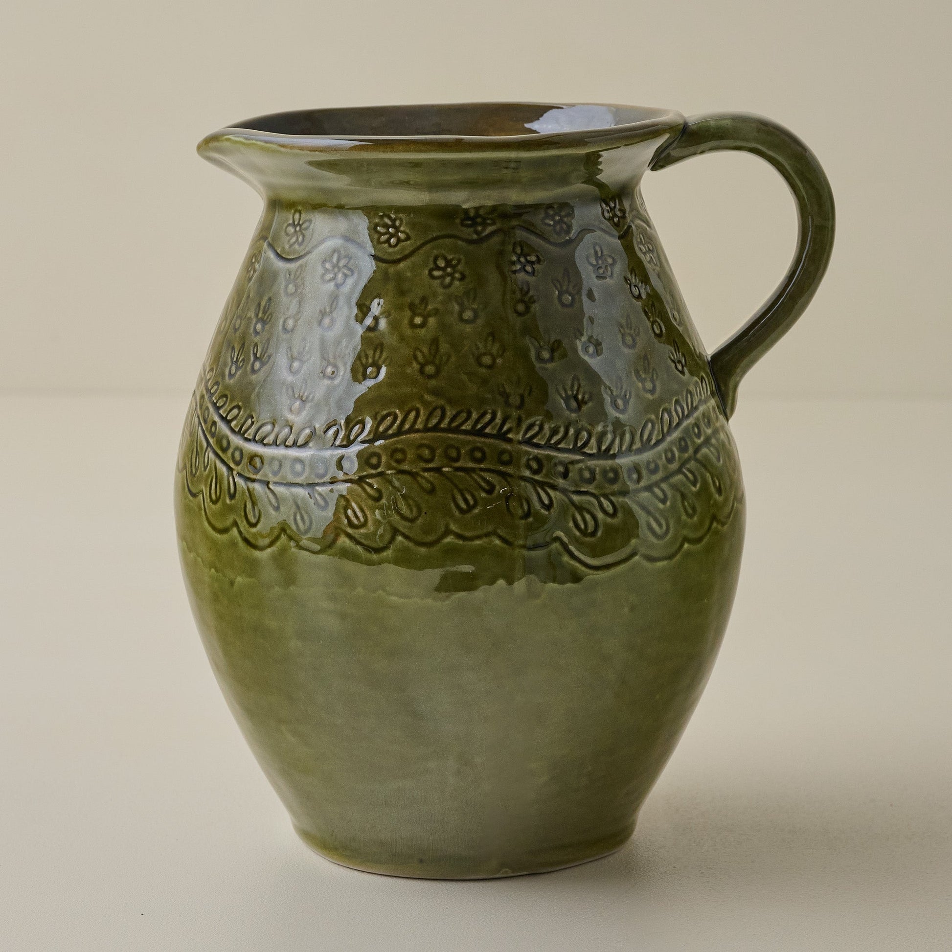 The Beatrice Carved Floral Pitcher adds a playful pop of green to your home with its charming ceramic design. Featuring a delicate carved floral motif, this versatile piece works beautifully as a vase or a cheerful accent.