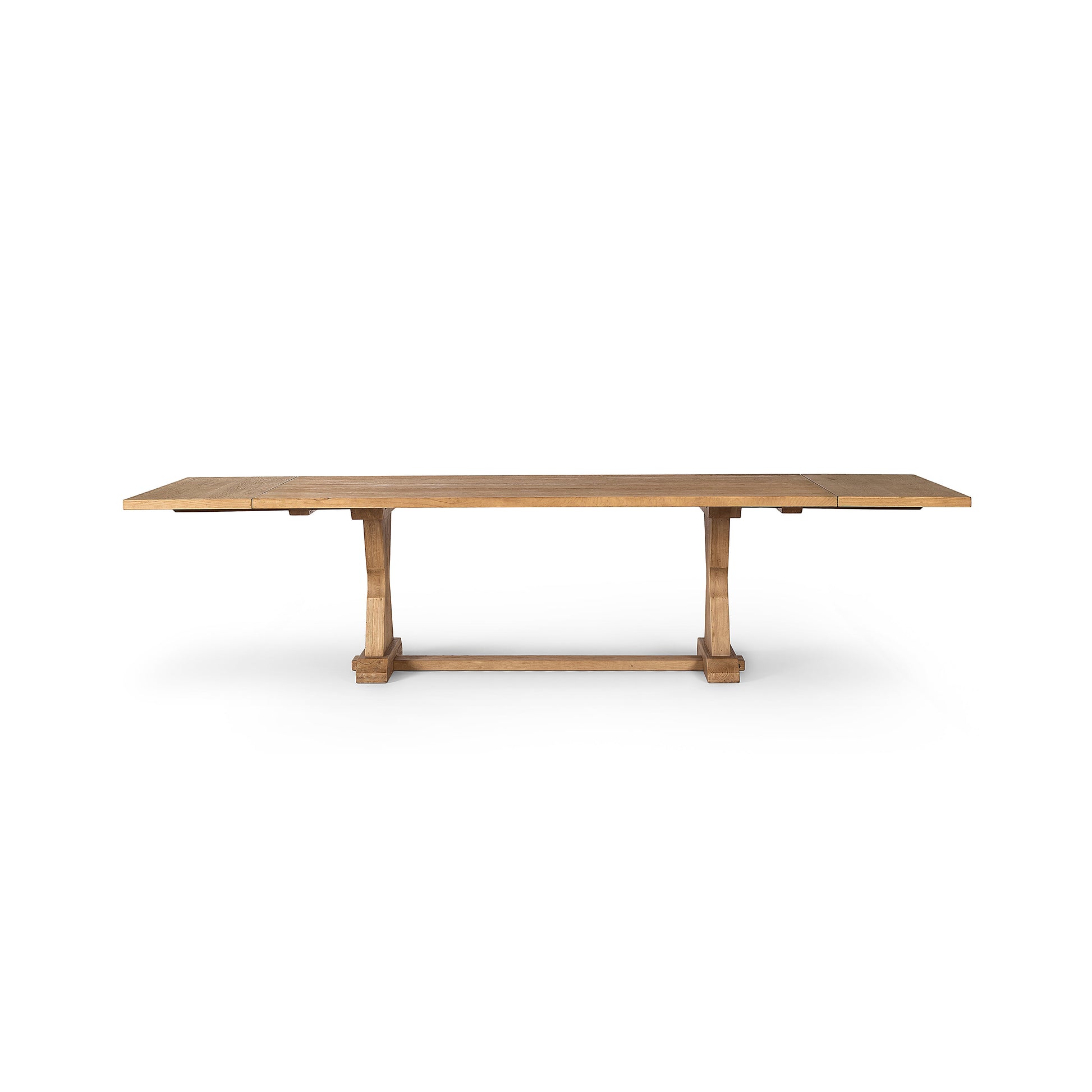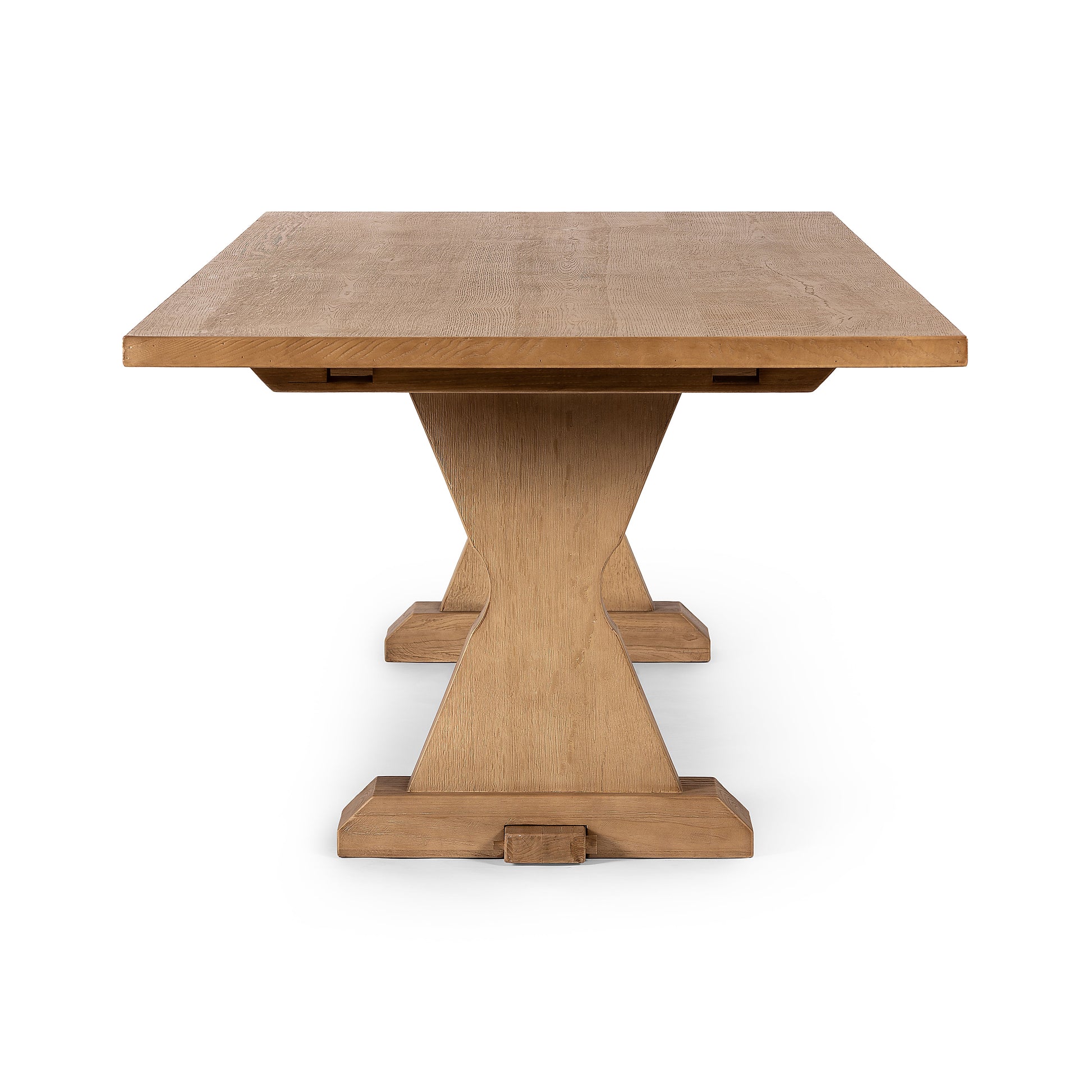 For an updated take on the traditional trestle table, a playful center cutout adds a geometric touch to an hourglass silhouette and classic breadboard top. Ideal for family dinners or hosting celebrations, the table extends from 88" to a generous 128", seating 8 when closed and up to 12 when fully expanded. Functional and stylish, it's ready for everything from weeknight meals to festive gatherings.