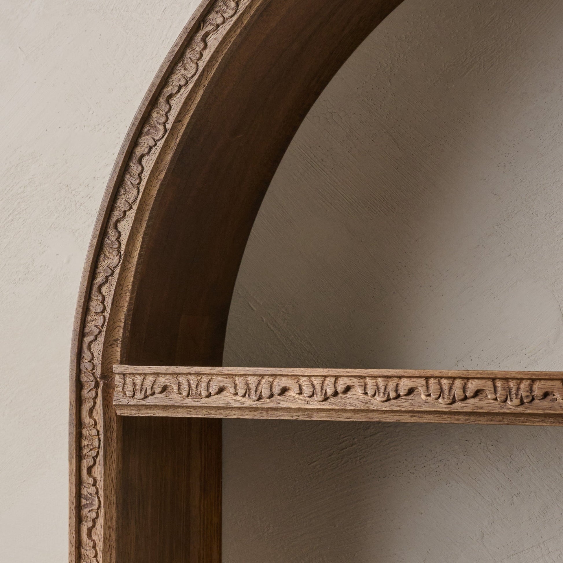 The Hand Carved Wooden Archer Shelf features a charming arch design with open shelves, perfect for displaying your favorite decor and cherished memories. Its handcrafted wooden construction adds a warm, natural touch to any room. Mounting hardware included.