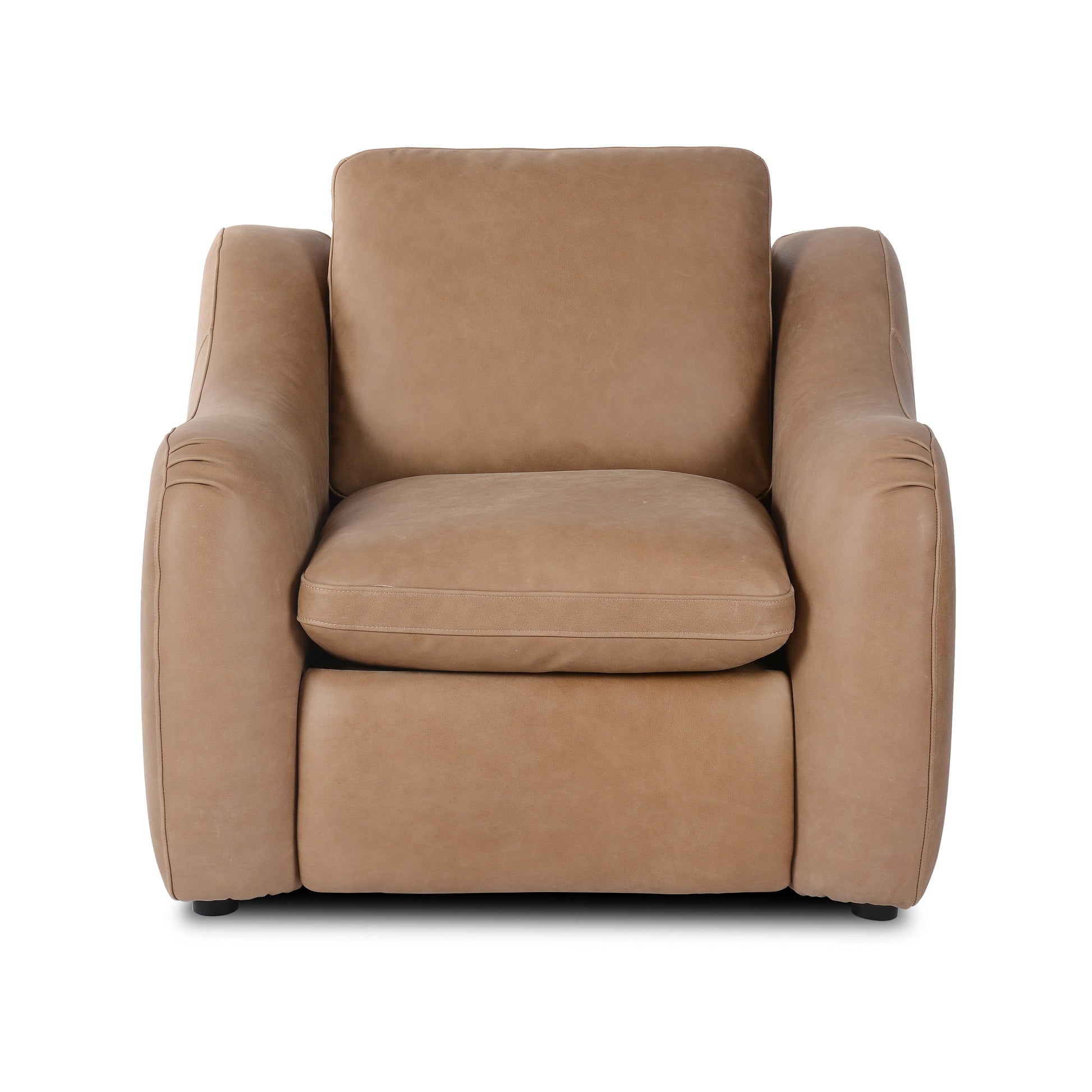 A modern take on the classic recliner the Chase Power Recliner allows you to customize your comfort level with the push of hidden, low-profile buttons. This cozy chair is available in two colorways and crafted from caramel top-grain leather or polyester, with fiber-and-feather blend cushions plus web suspension for a plush, sink-in experience. A deployable footrest meets luxury with comfort.