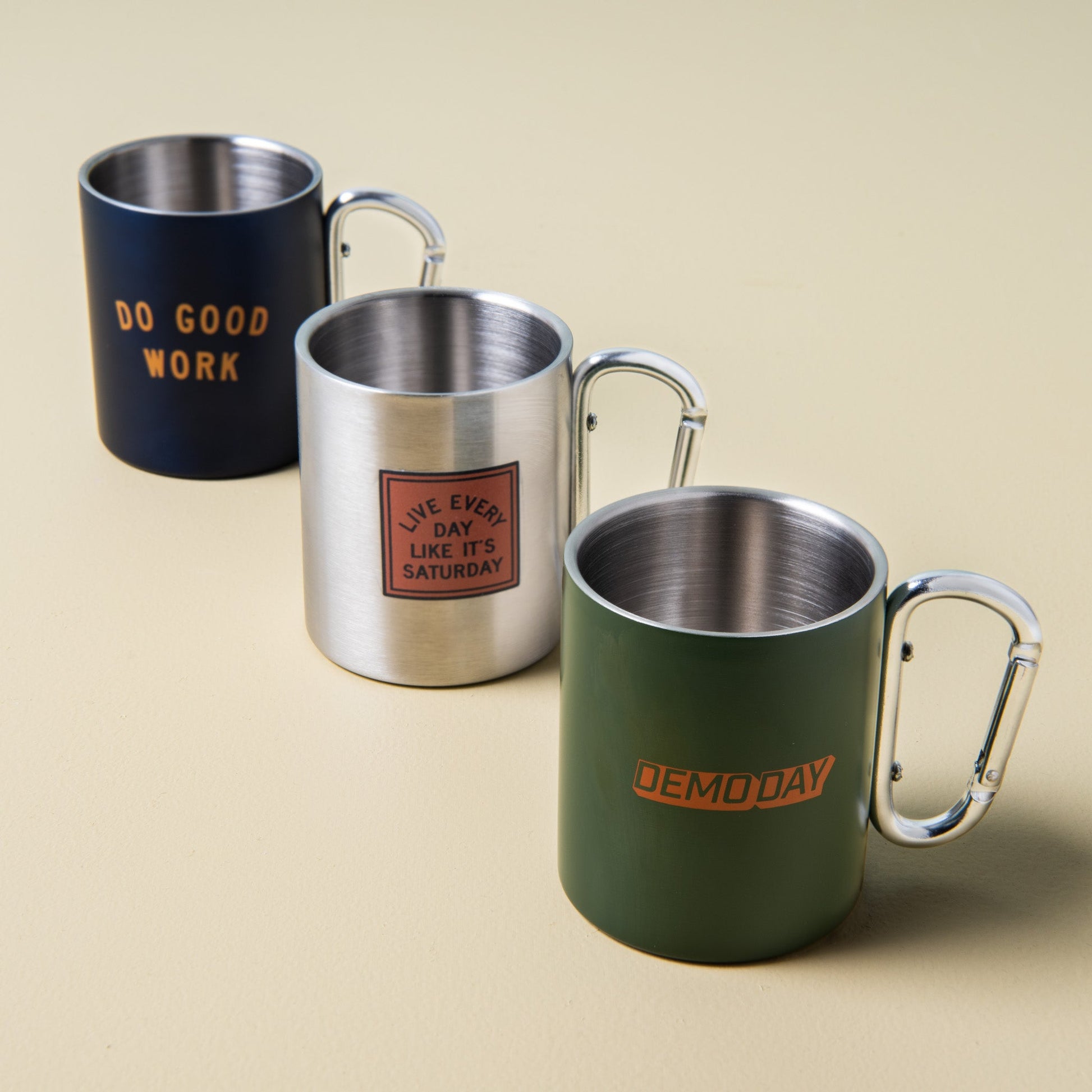 Stay fueled through your next project with the Chip’s Demoday Mug. Tough enough for the jobsite, this mug features double-walled stainless steel construction and a metal carabiner handle.