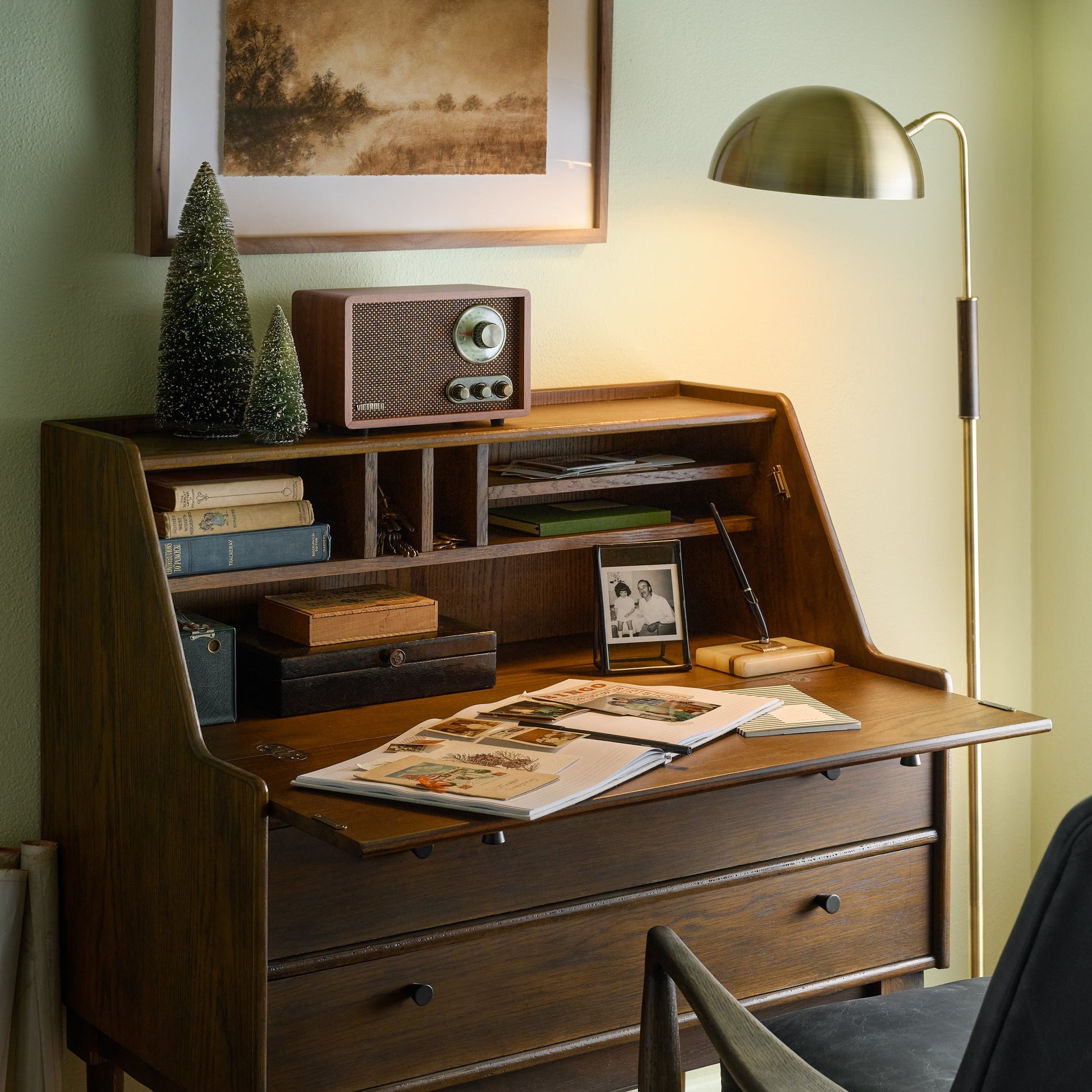 Walnut wood accents and an antique brass finish give the Clouseau Floor Lamp a stately presence and inviting warmth. Featuring an arching silhouette and domed shade, this traditional floor lamp provides ideal lighting for an office or a reading nook.