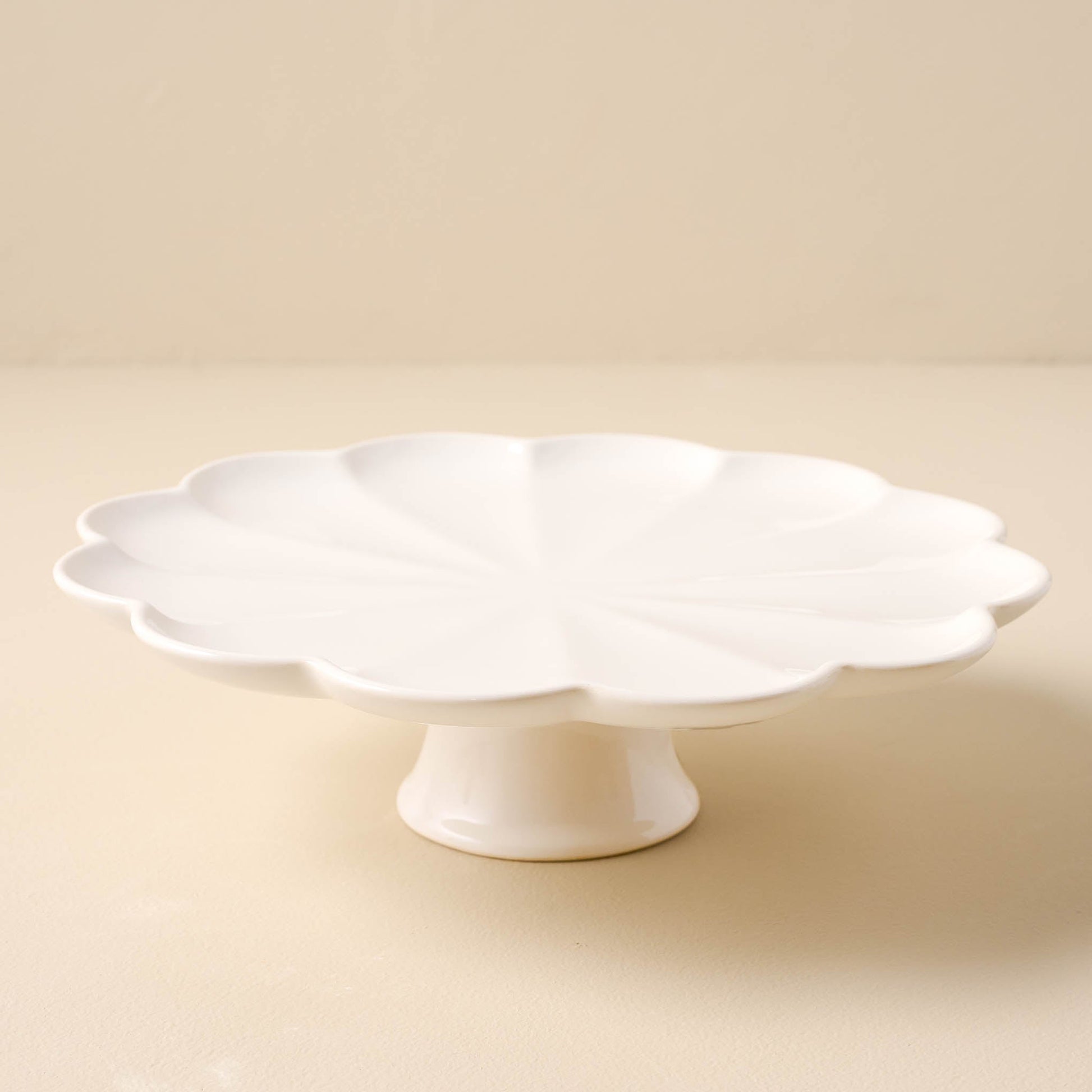 Made from sturdy stoneware and a reactive glaze, this elegant cake stand features a cream pedestal base and scalloped top finished with subtle speckles. Simple and sweet, this stand is worthy of elevating your best culinary creations.