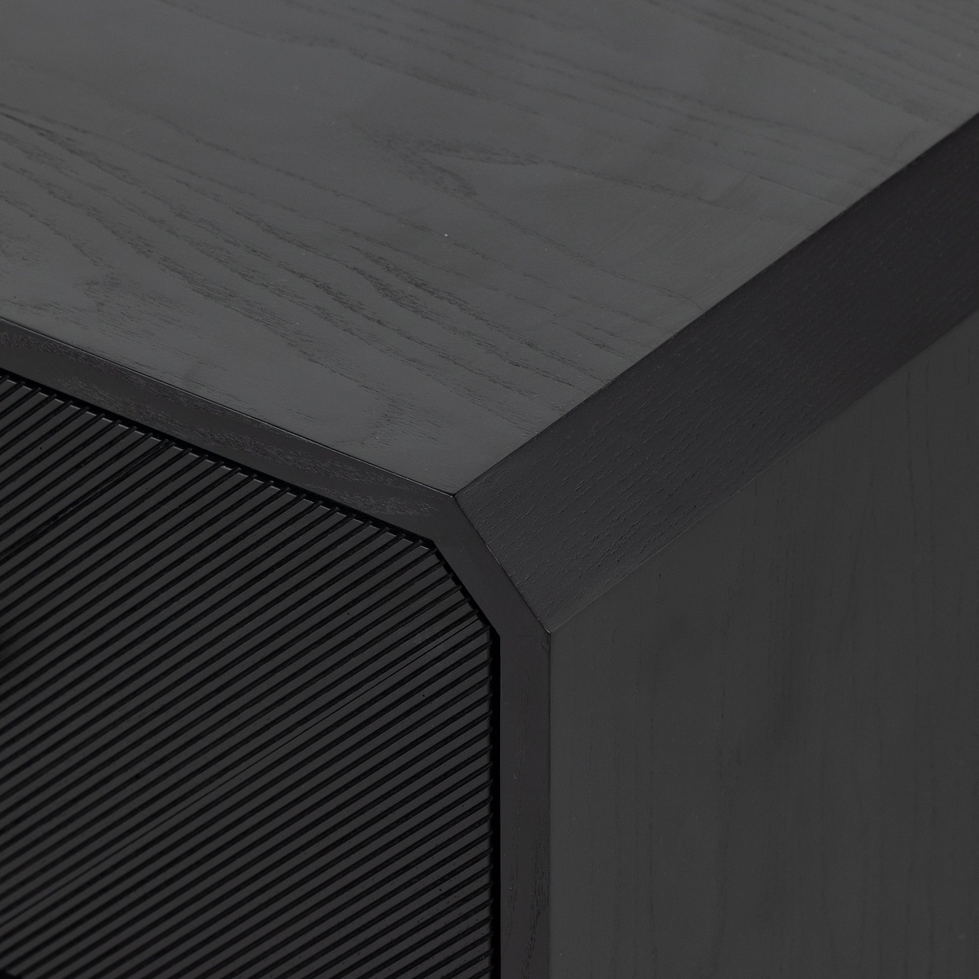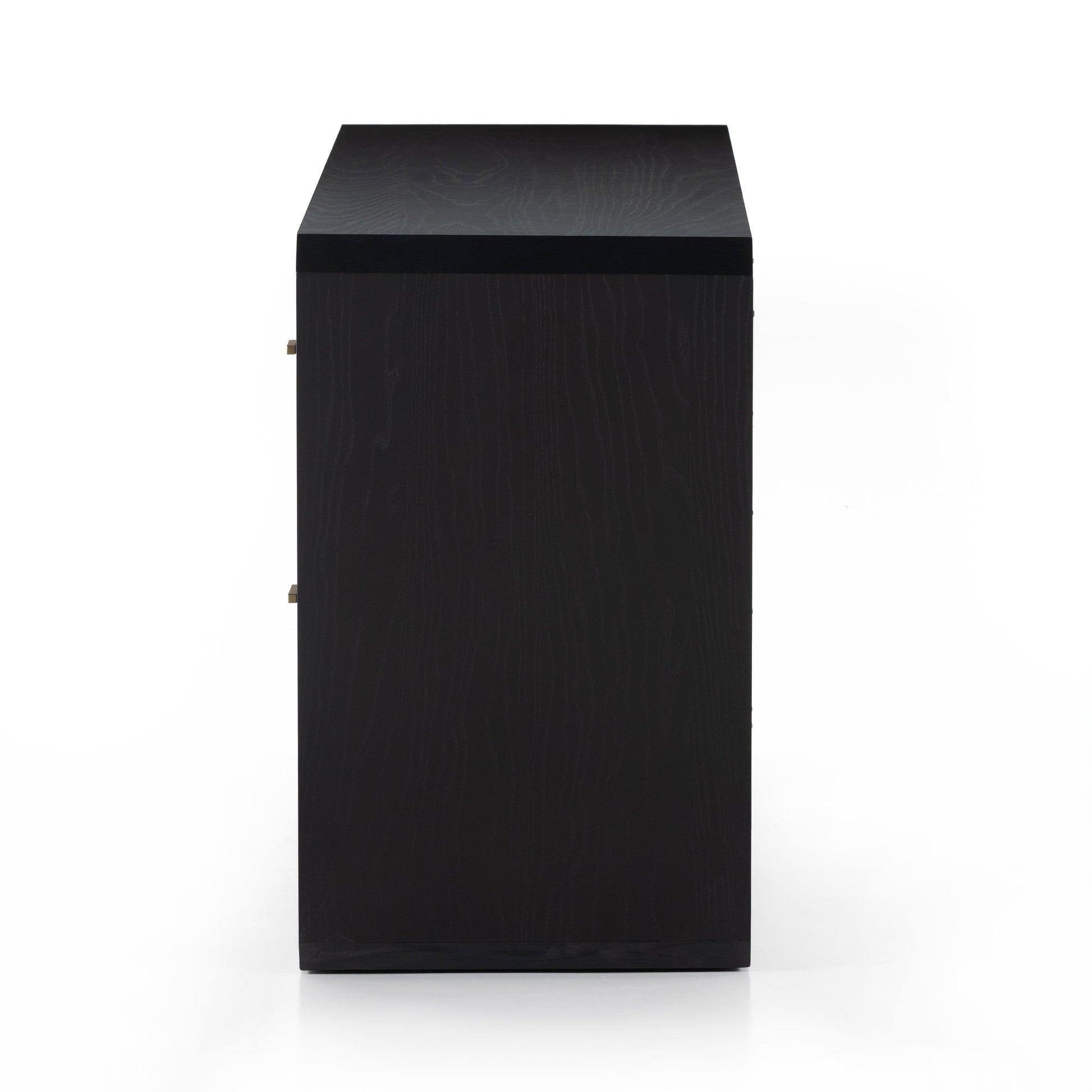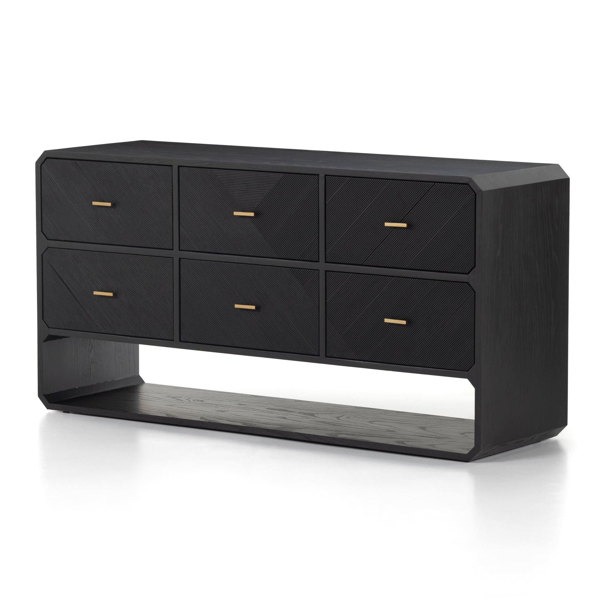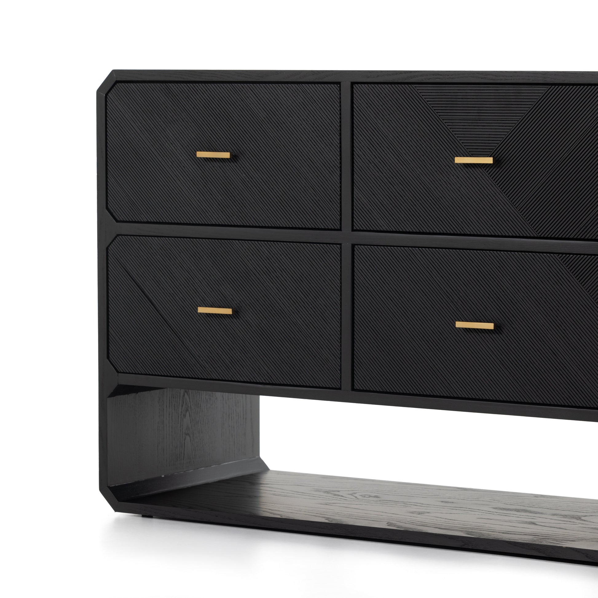 This modern dresser, with its sleek and timeless design, offers plenty of storage. Natural ash or black veneer is adorned with satin brass handles for a sophisticated look that suits any space.