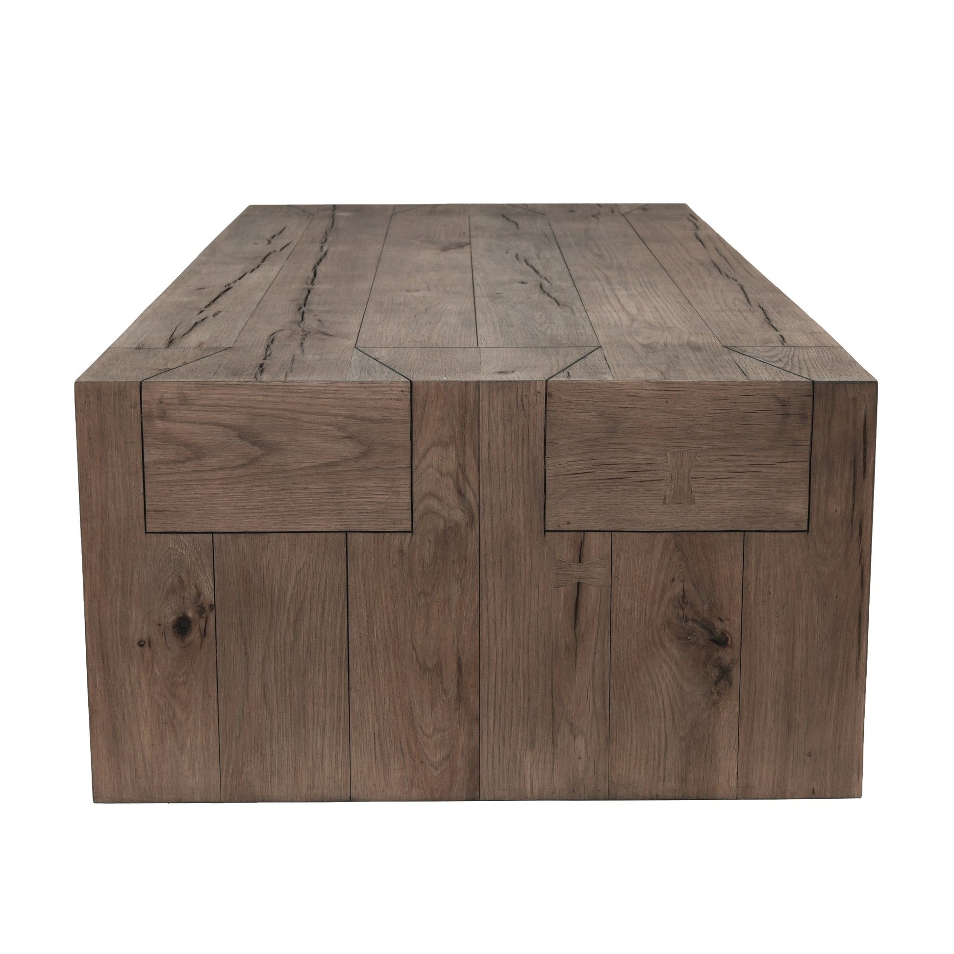 A spacious spot for puzzles, game nights with friends, or to put your feet up while watching a movie—this low, large-scale coffee table will bring an inviting feel to your space. Crafted from oak wood, its natural beauty is highlighted with oversized dovetails and a distressed finish.