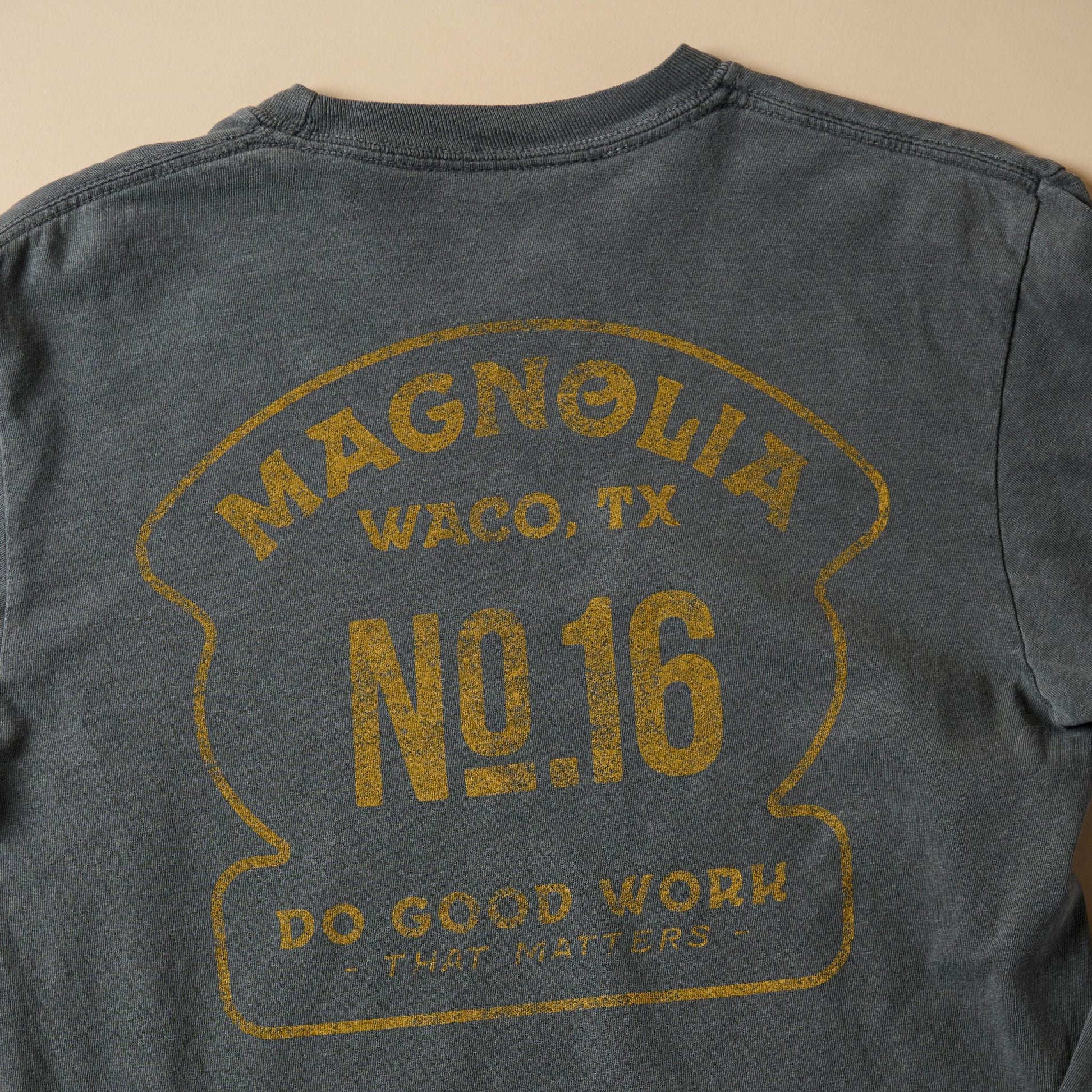 Inspired by our belief in doing good work that matters, this tee features a graphic across the back that reads, “Magnolia | Waco, TX | No. 16 | Do good work that matters” and “No. 16” printed on the front left chest. Made from 100% cotton, this relaxed-fit tee is garment washed for a super soft feel, lived-in charcoal hue, and minimal shrinkage.