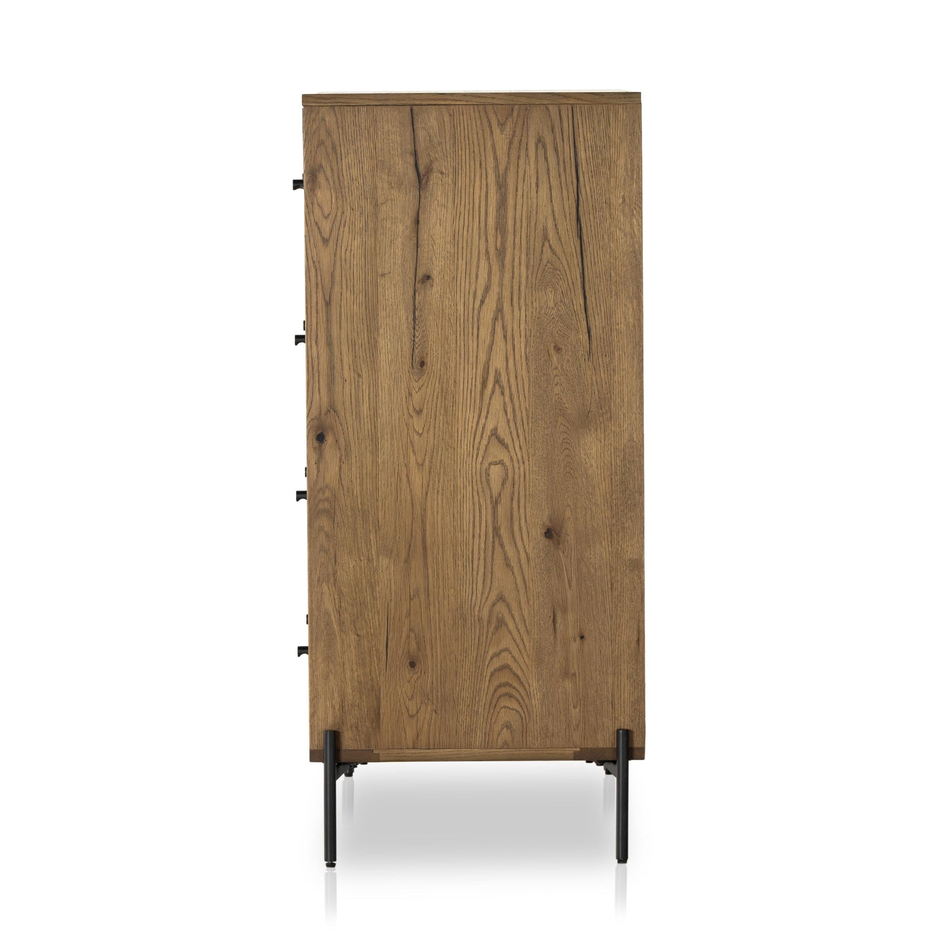 Dark resin showcases the natural grain of light-finished oak for textural effect in the Liam 5 Drawer Dresser. Five drawers provide ample storage and gunmetal-finished hardware provides a crisp, industrial finish.