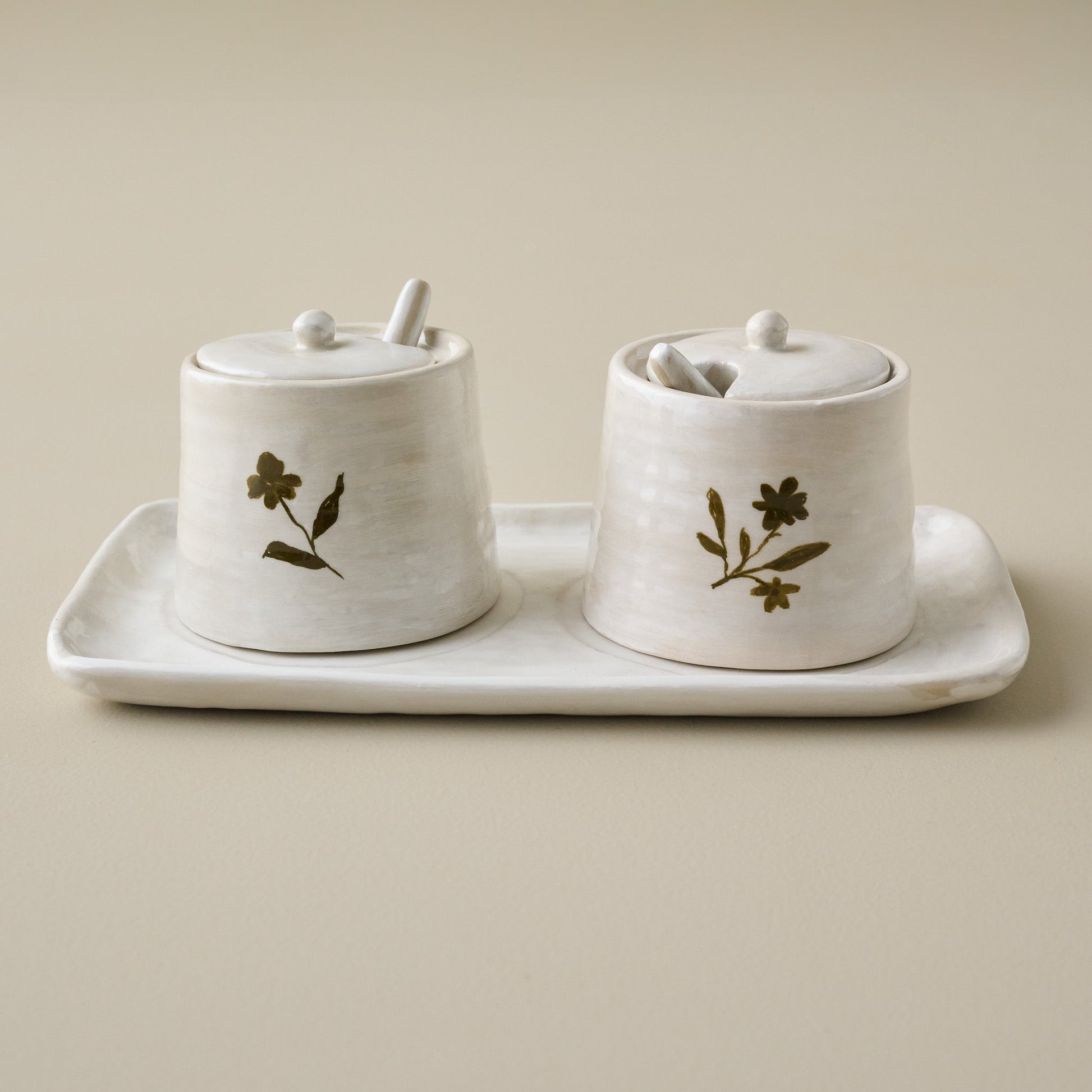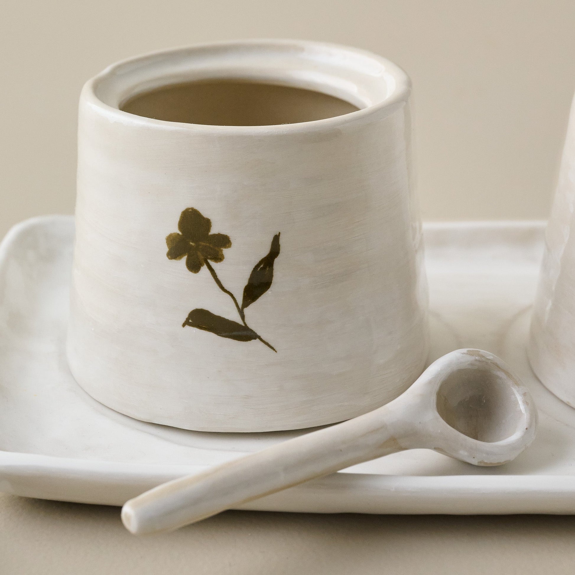Brimming with charm, this ceramic salt + pepper set adds an elegant flourish to the kitchen or table. The jars come with individual lids and spoons, plus a tray to rest atop. To note: Our team designed the wildflower motif as an homage to Jo’s garden. It’s a detail you can find in our Eliana Floral Container to store other cooking essentials, as well.