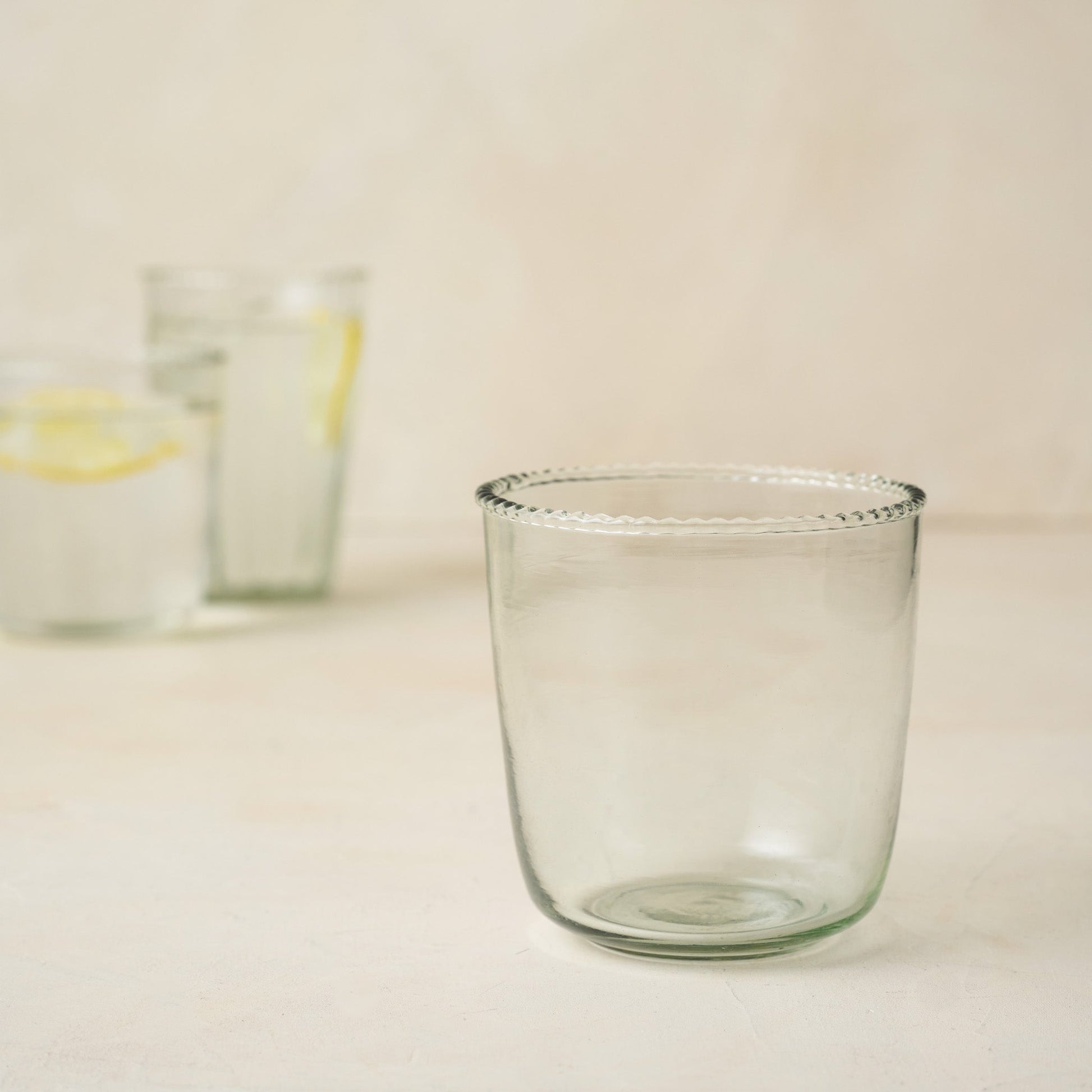 Refined details bring a delicate beauty to everyday living in the Elizabeth Bottle Cut Glass Tumbler. Handmade and available in two sizes, the short tumbler features a wave rim detail and clear glass body, while the larger glass features a fluting and dot pattern throughout the body, in addition to the waving rim.