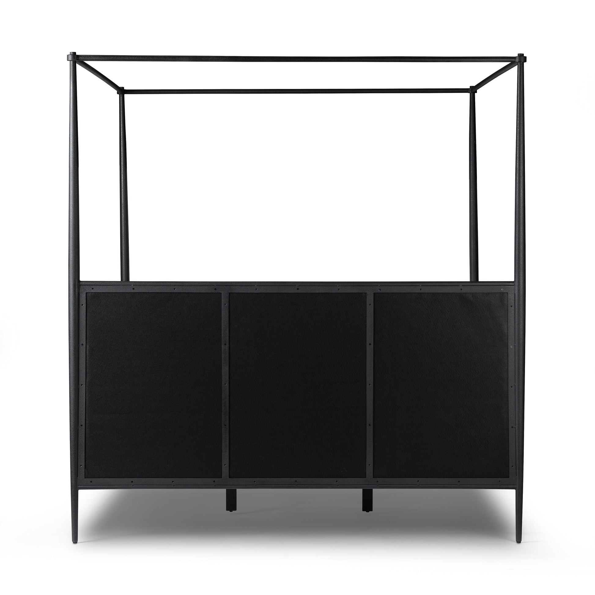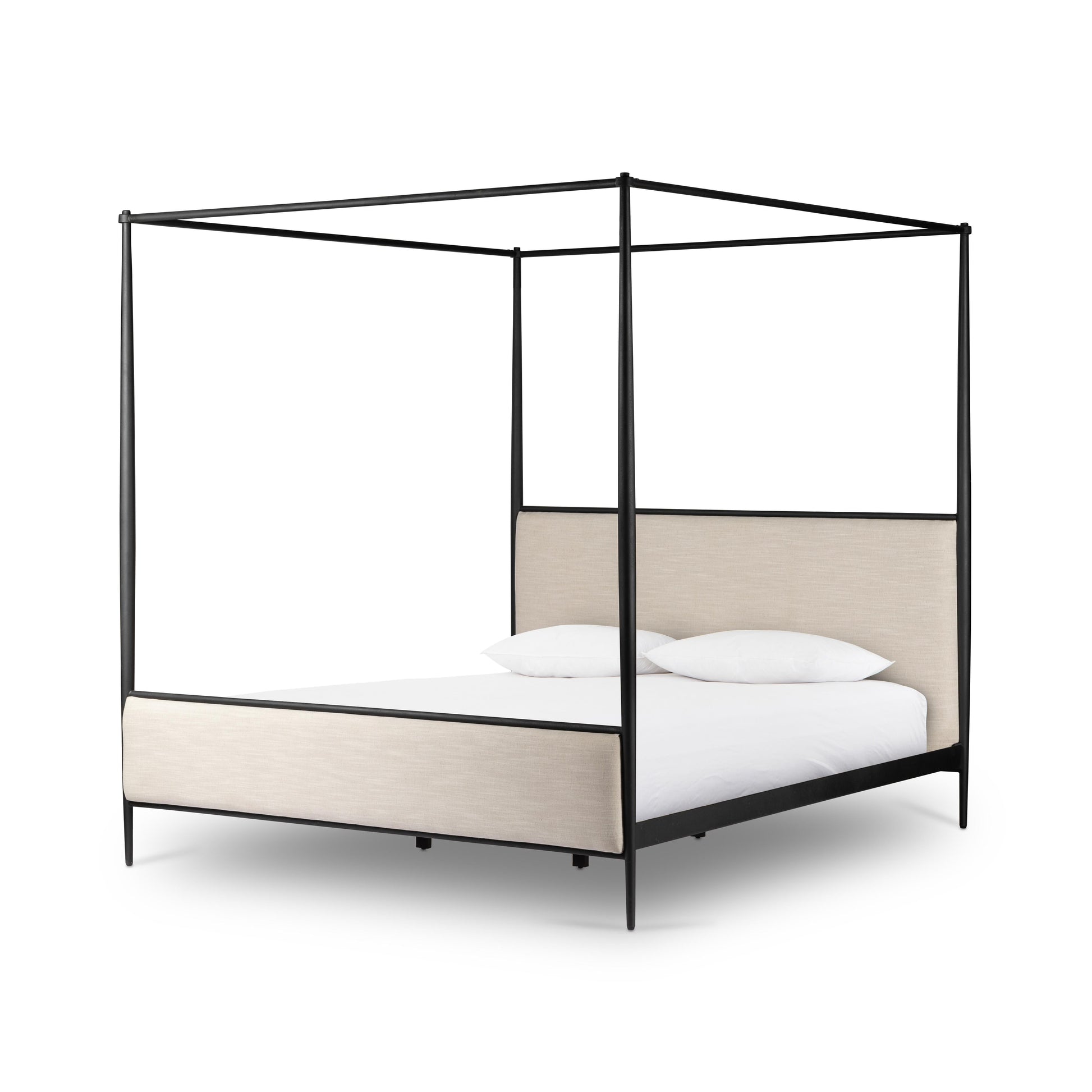 Bold and timeless, the Emery Canopy Bed is fashioned from tapered black iron for a substantial look. A contrasting headboard and footboard—both upholstered in a traditional cream shade—add elegance and balance to the frame.