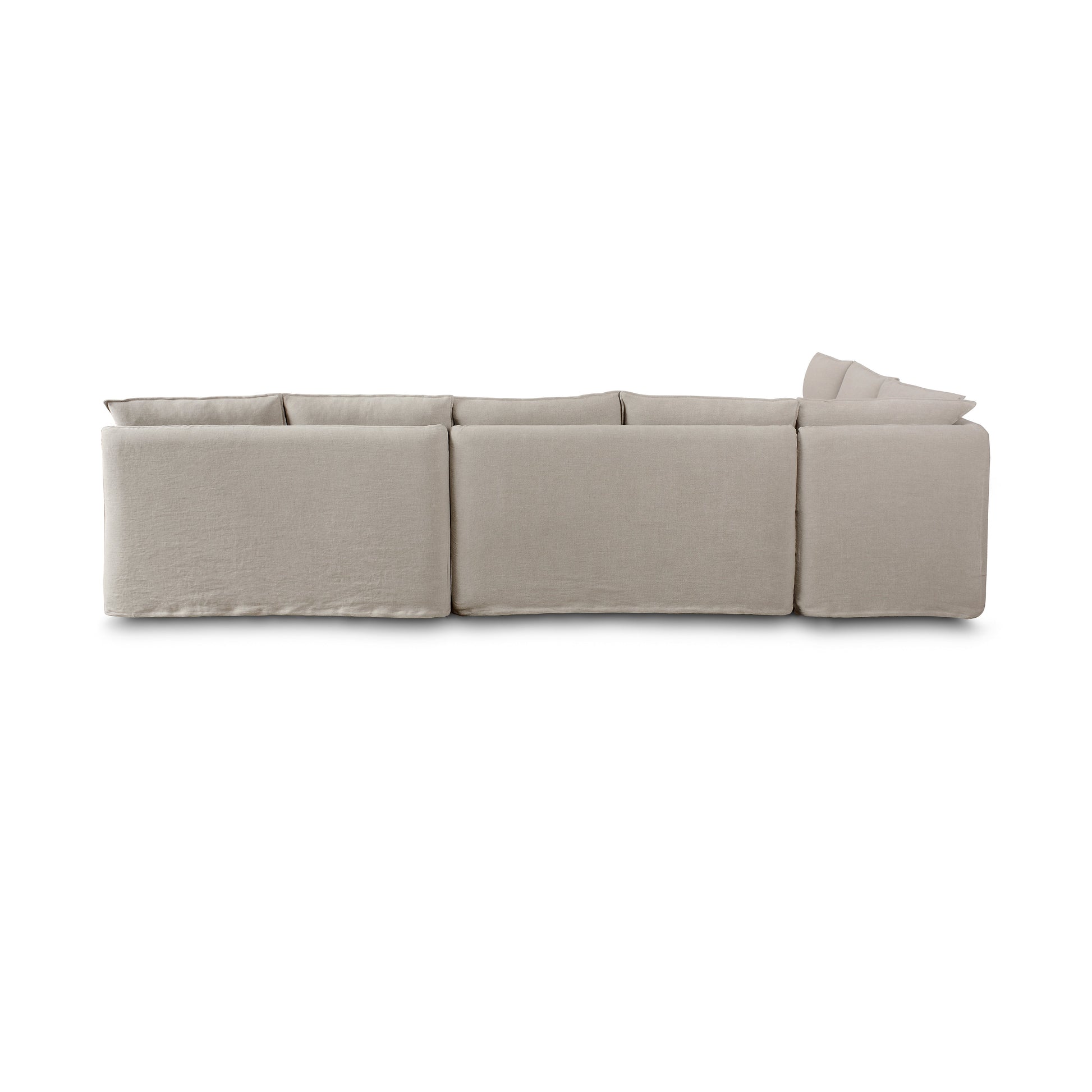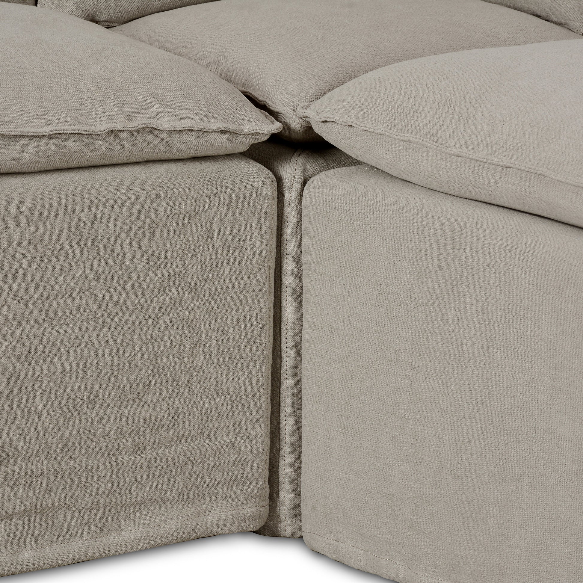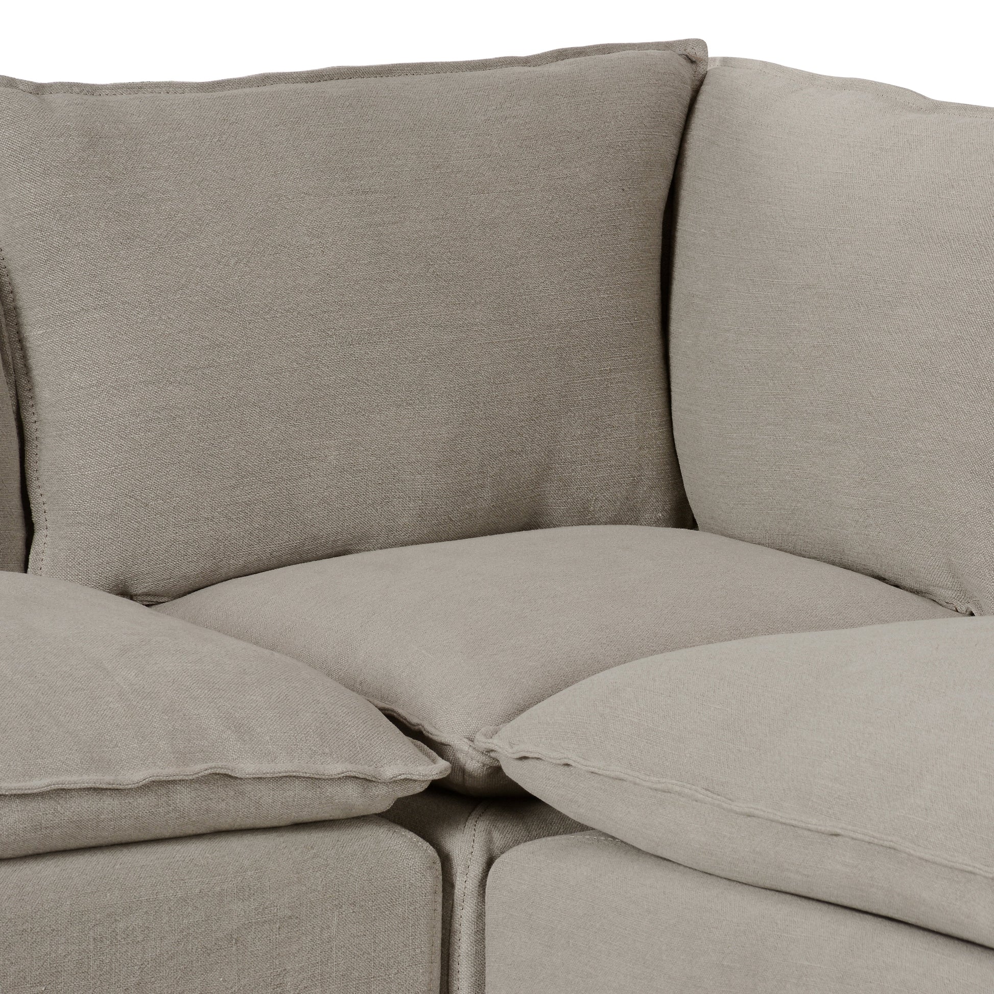 A slipcovered modular banquette offers a clean, contemporary feel with casual flexibility. Feather-blend cushioning for sink-in comfort pairs withflanged top seams for a tailored look. Fully removable slipcover is handcrafted from 100% flax/linen, bringing a loose, relaxed look to the entire piece. Available in three sizes.