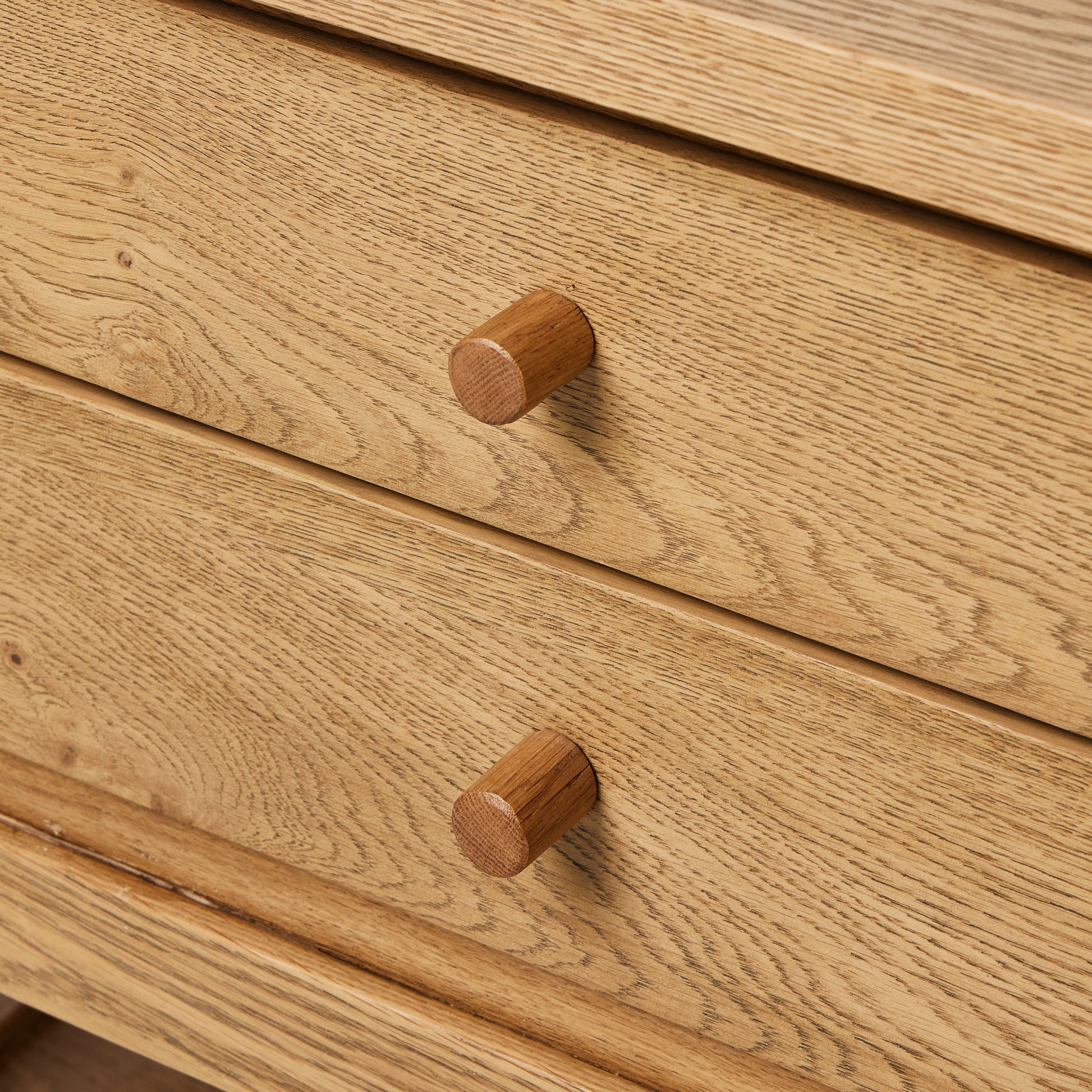 Made from light, natural oak, the design of this two-drawer nightstand is inspired by a vintage general store counter. Softened corners and simple knob complete its heritage charm.