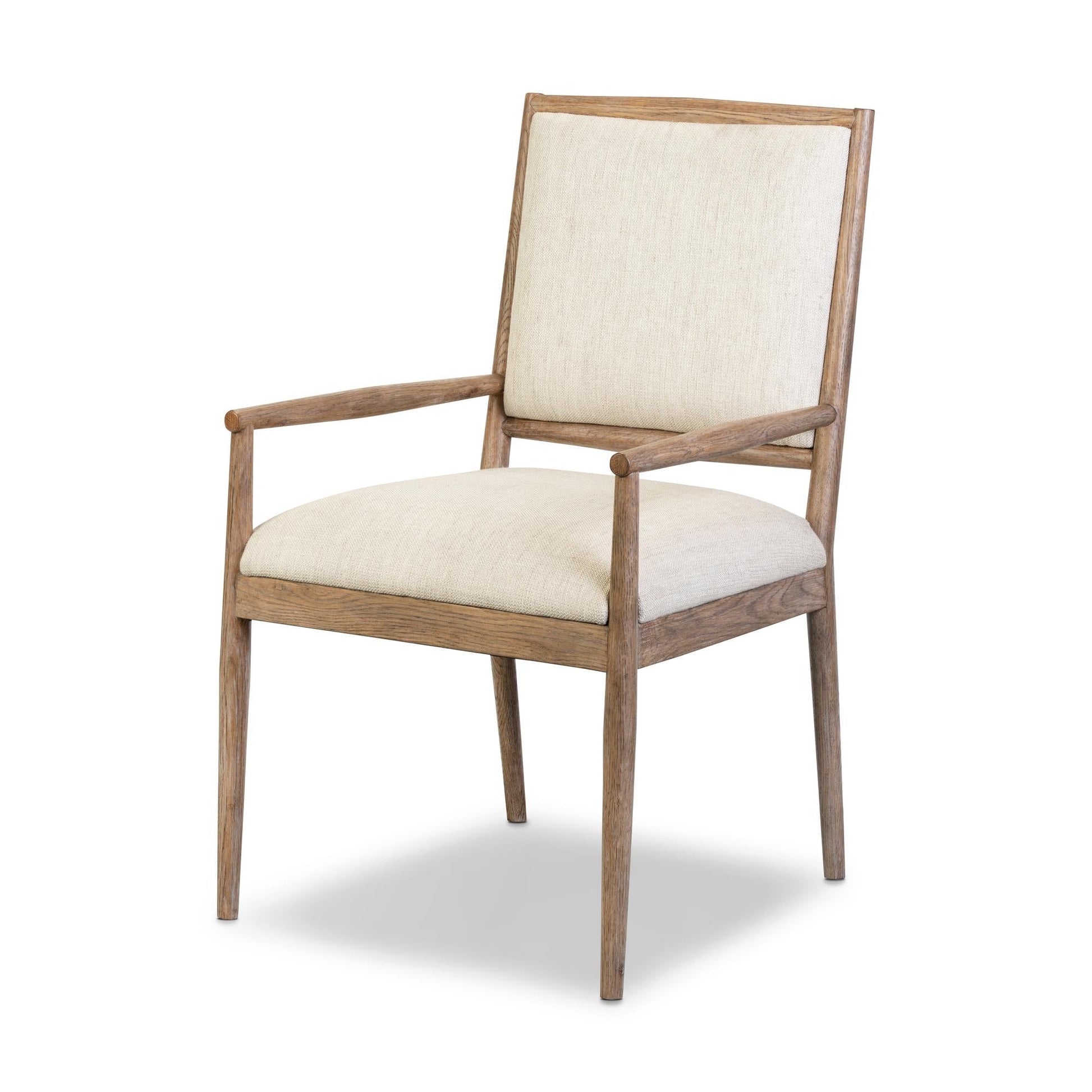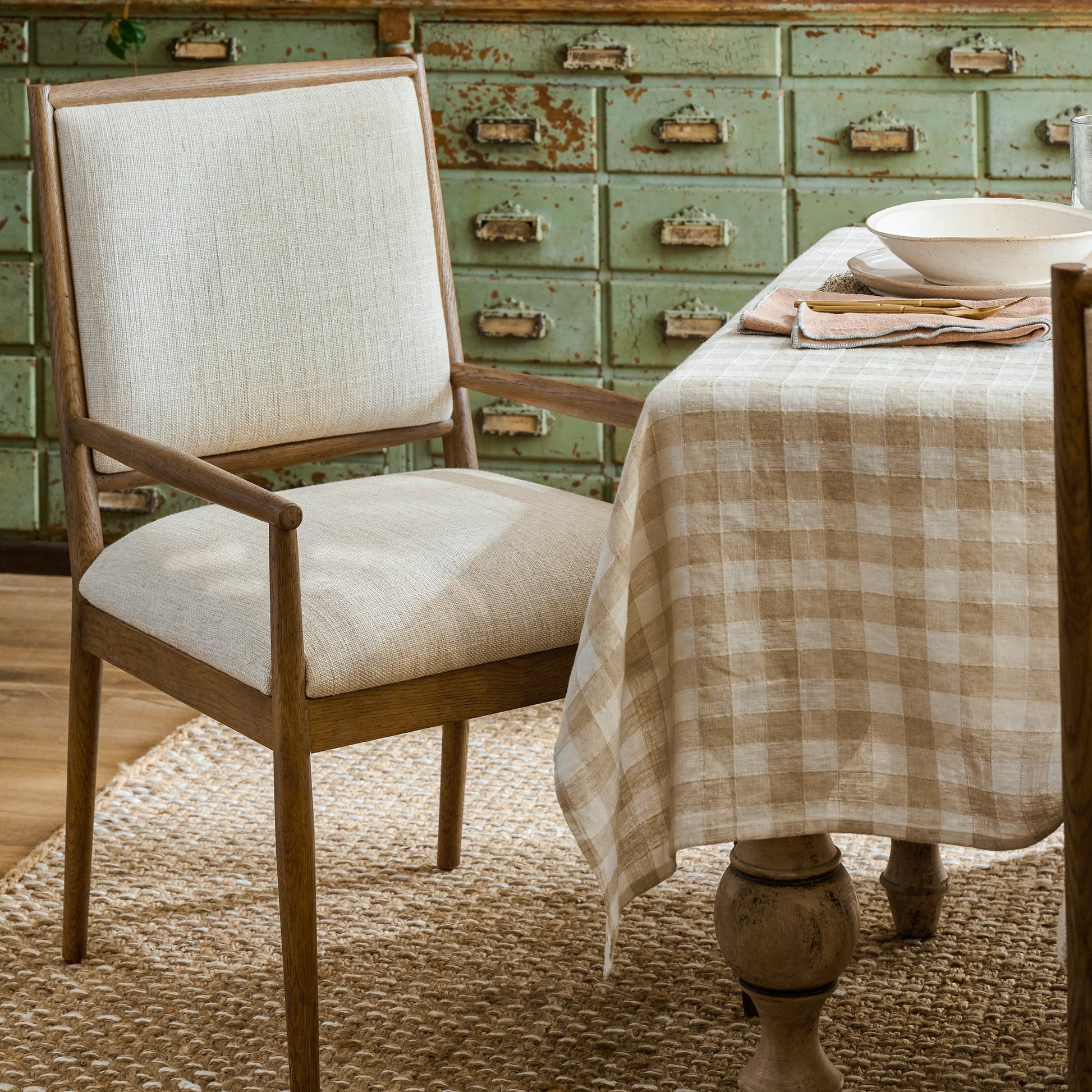 The Flint Dining Armchair features a weathered oak wood frame and natural-hued, linen-like upholstery. Slightly tapered spindle framework creates a traditional, streamlined silhouette to side any table.