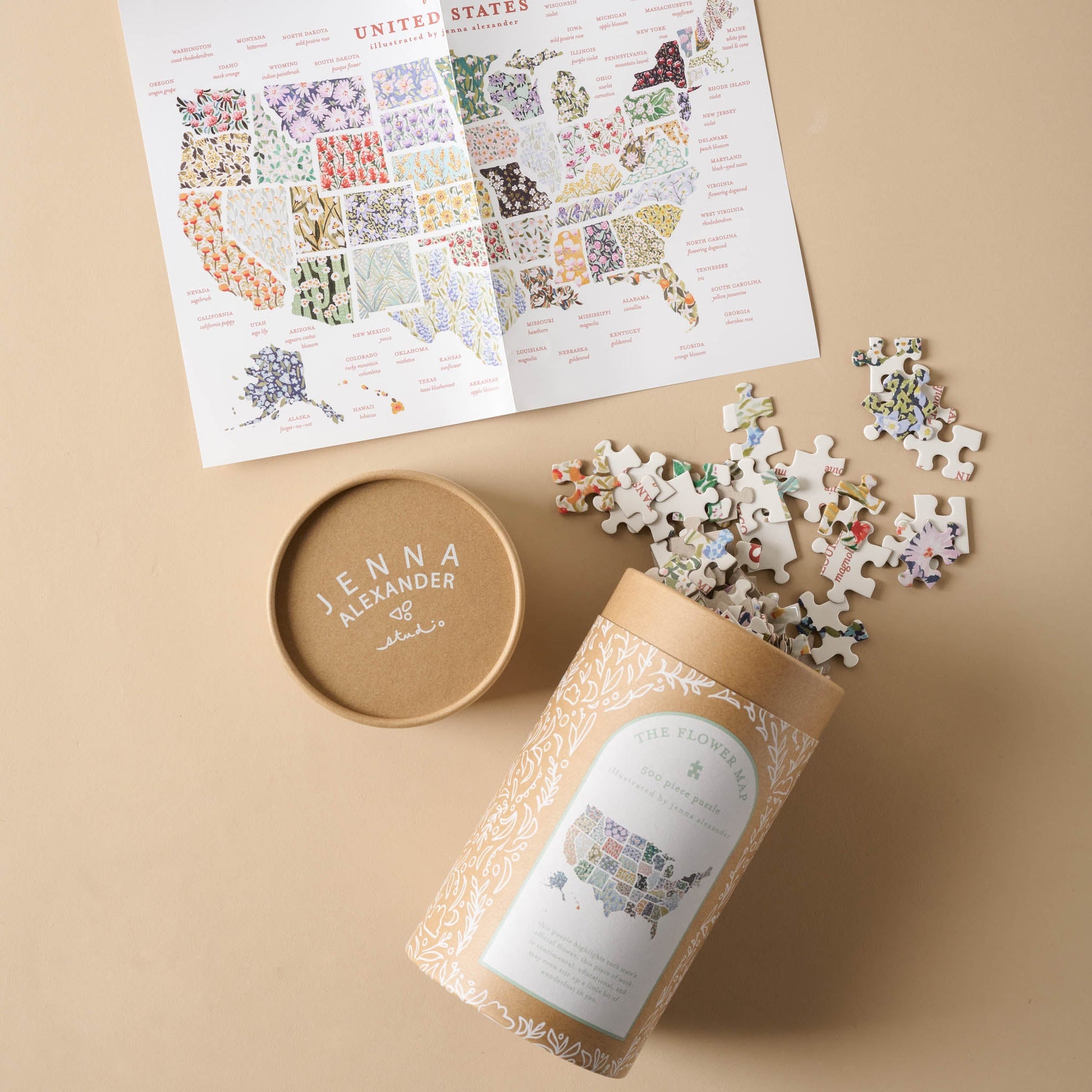 Highlighting bright blooms country-wide, this puzzle features a colorful illustration of the USA and state flowers from across the nation. This 500-piece puzzle comes packed in a canvas bag and spans 18 x 24 inches when completed. Illustrated by Jenna Alexander.