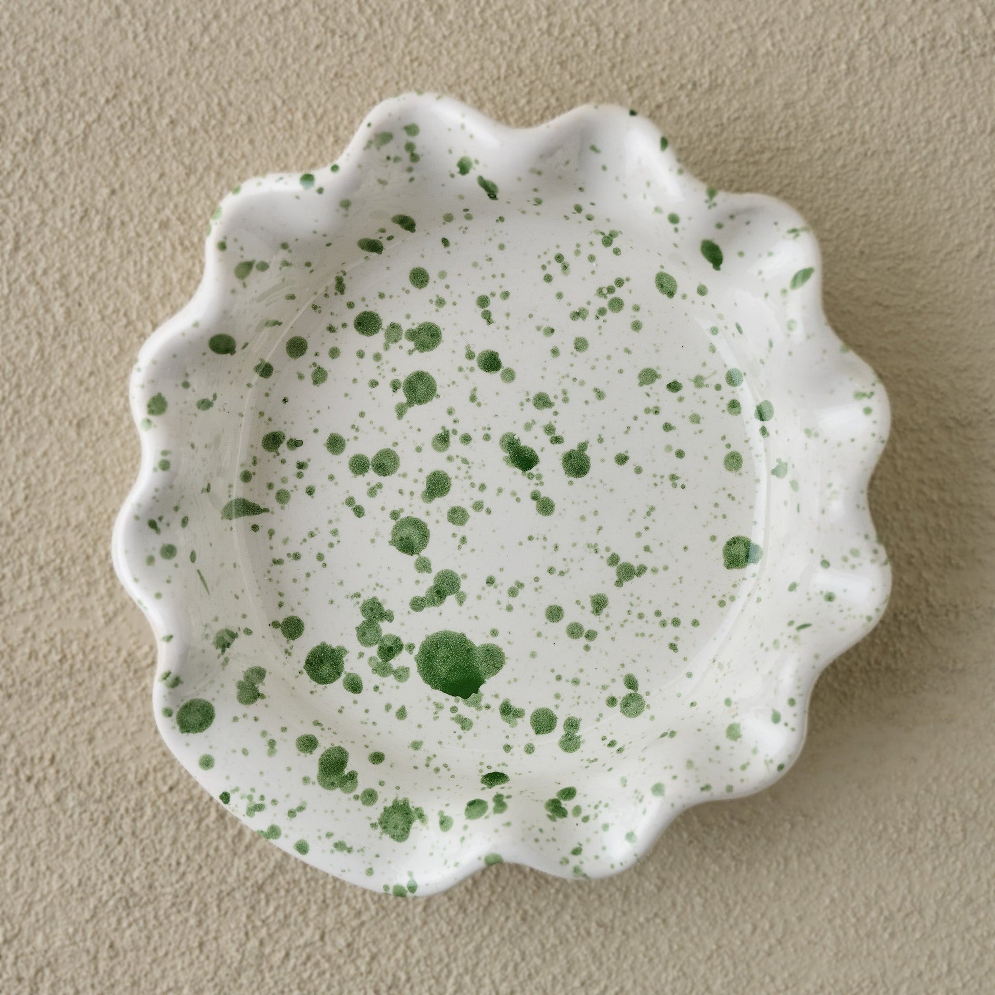 Rest cooking utensils atop this spoon rest with elegantly ruffled rims and a charming green hue. The colorful splatter glaze gives each piece a unique, handcrafted look—one that can inspire embracing creativity in the kitchen. Expect subtle variations due to the artisanal process.