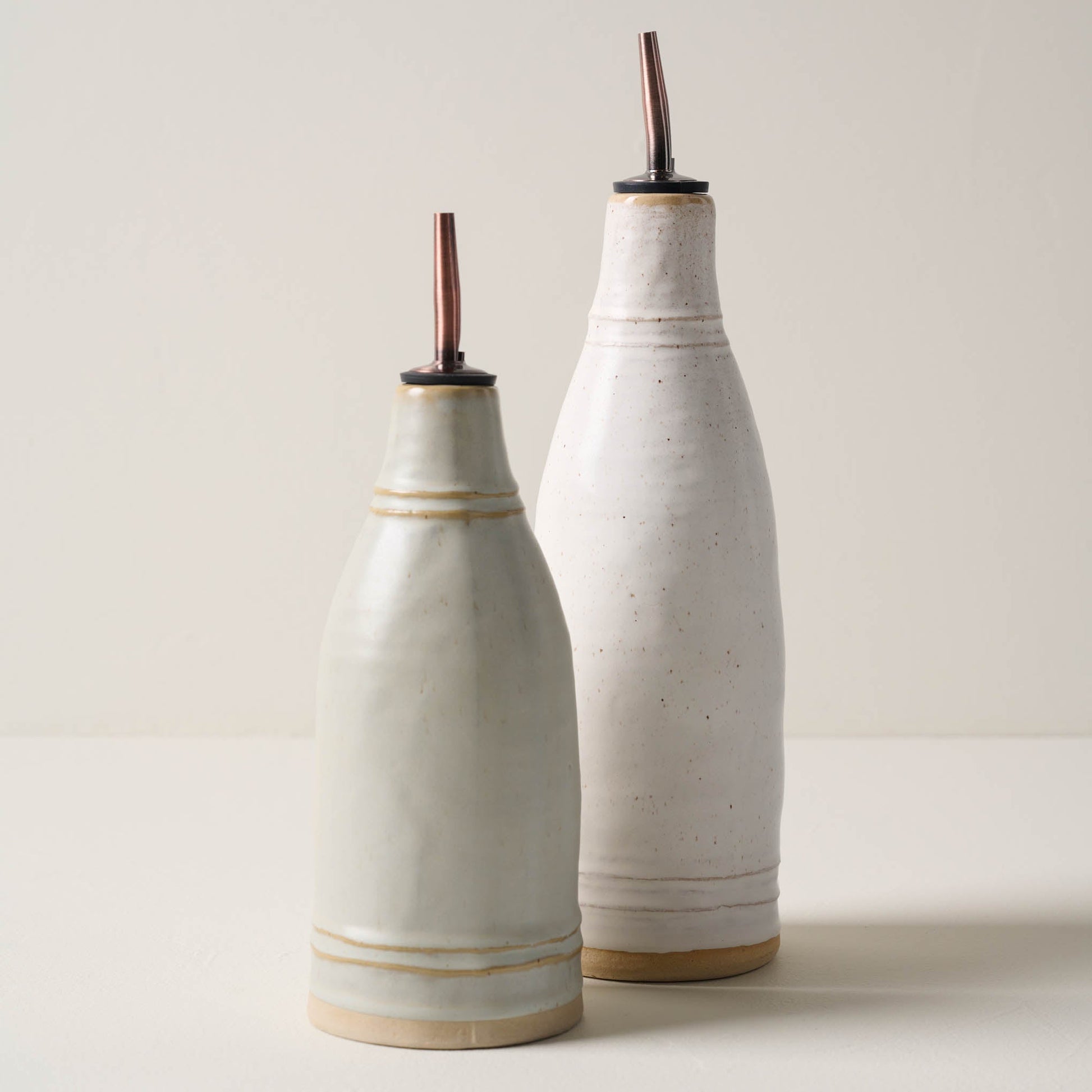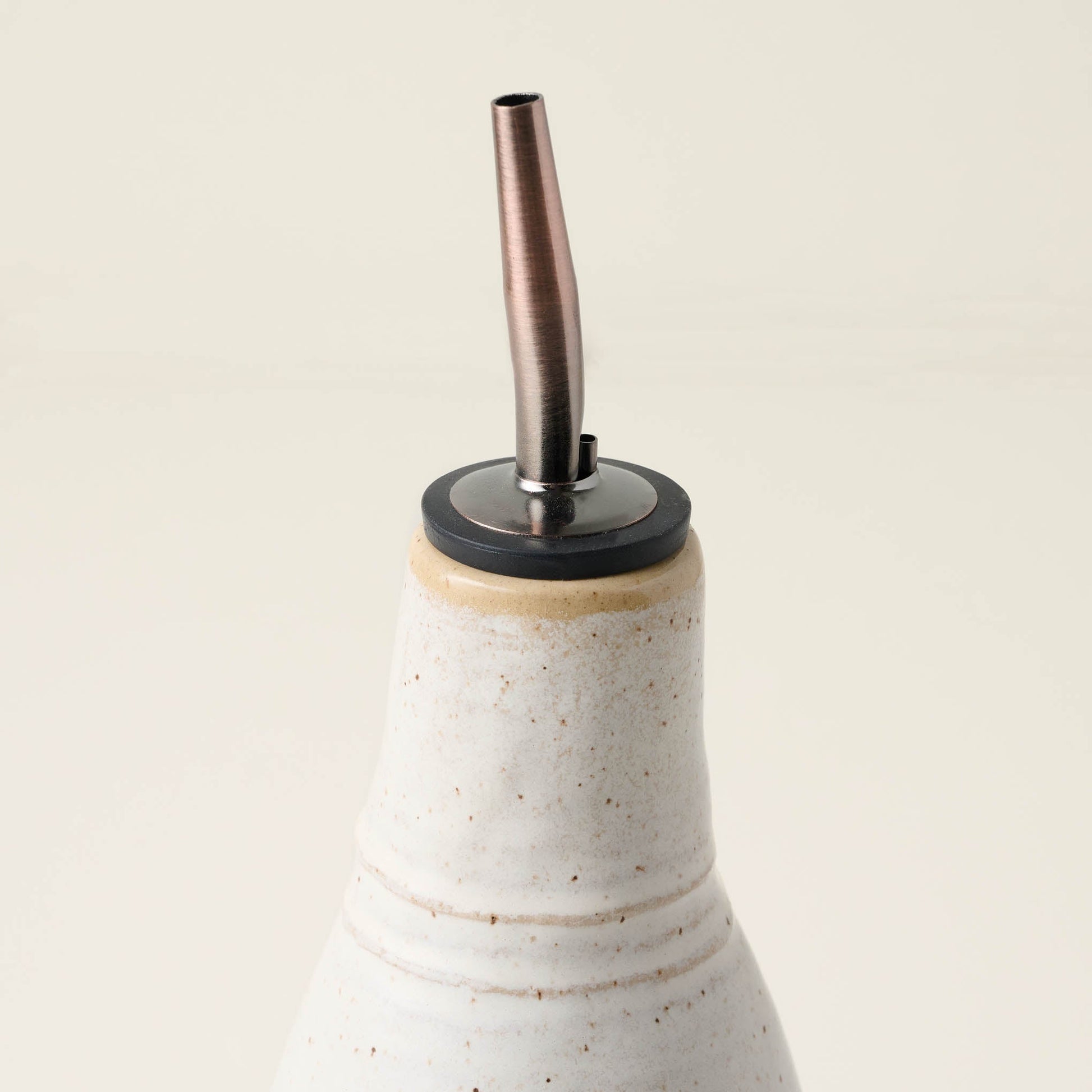Pour easy with our French White Speckle Oil Pour. Featuring a creamy white glaze and a subtle speckled texture, this 30 oz. stoneware bottle beautifully suits any countertop. Pair with the French Grey Vinegar Pour for an elegant set.