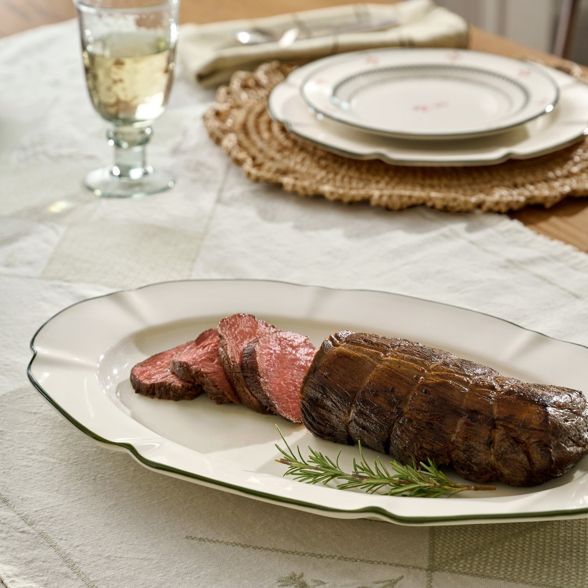 This exquisite serving platter, with its green rim, is a new addition to our best-selling Luna Collection. The hand-painted scalloped edge imparts a subtle elegance to your tablescape at any time of the year.