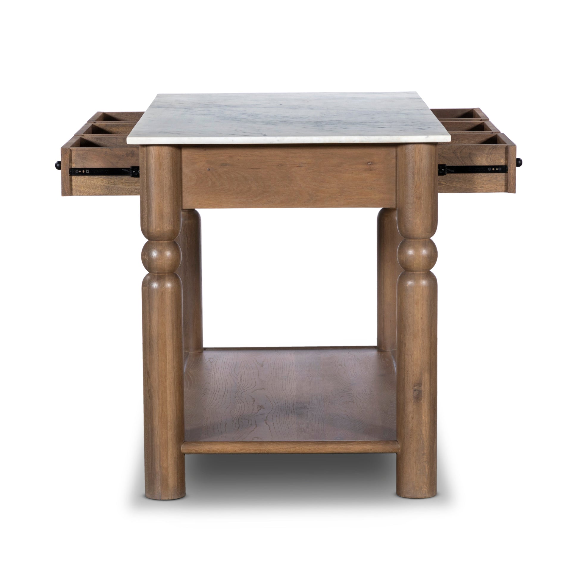 Gather in the kitchen with this antique-inspired island with a fresh geometric twist. Finished in toasted oak and paired with white marble, it offers functionality with three drawers on each side, plus a spacious bottom shelf for bonus storage.