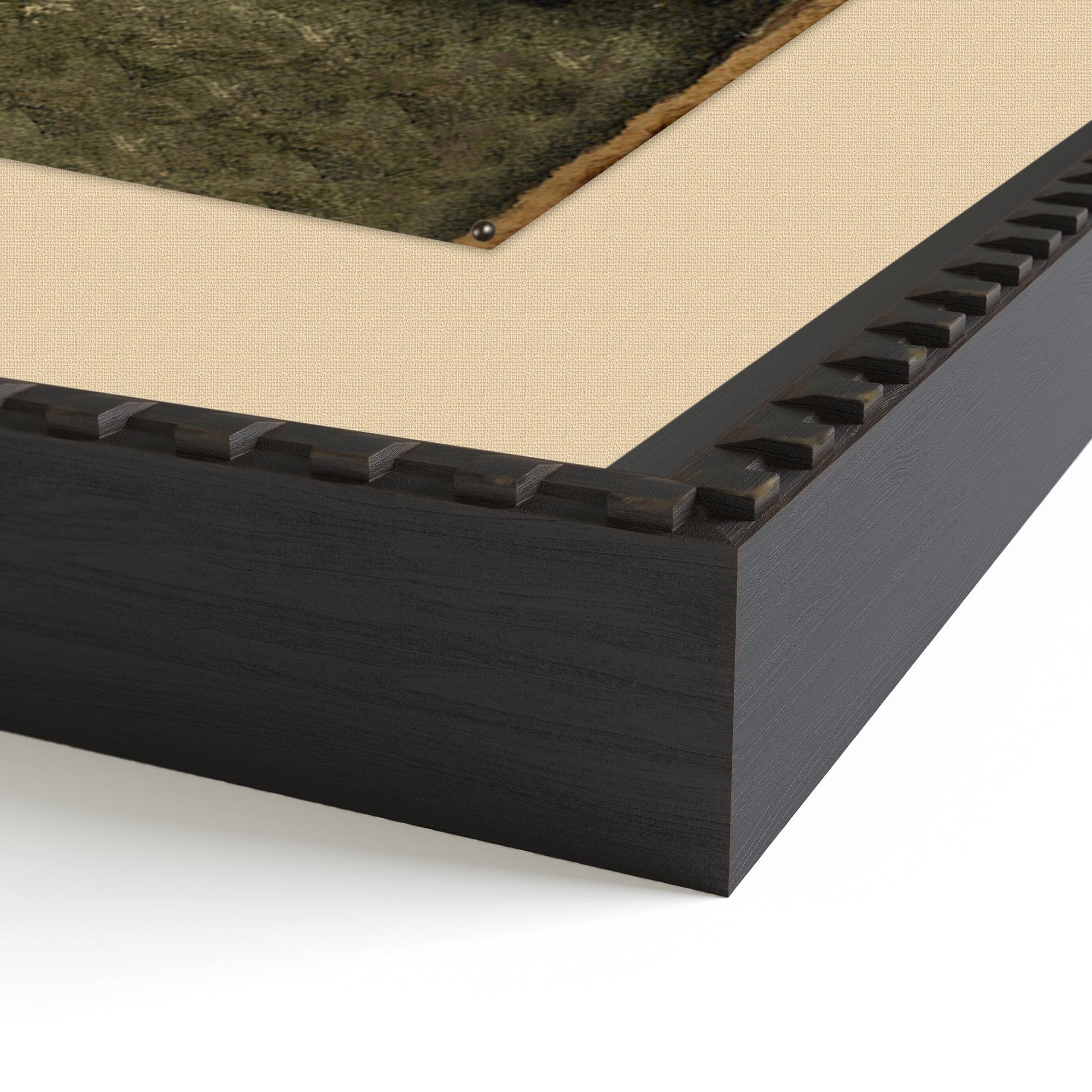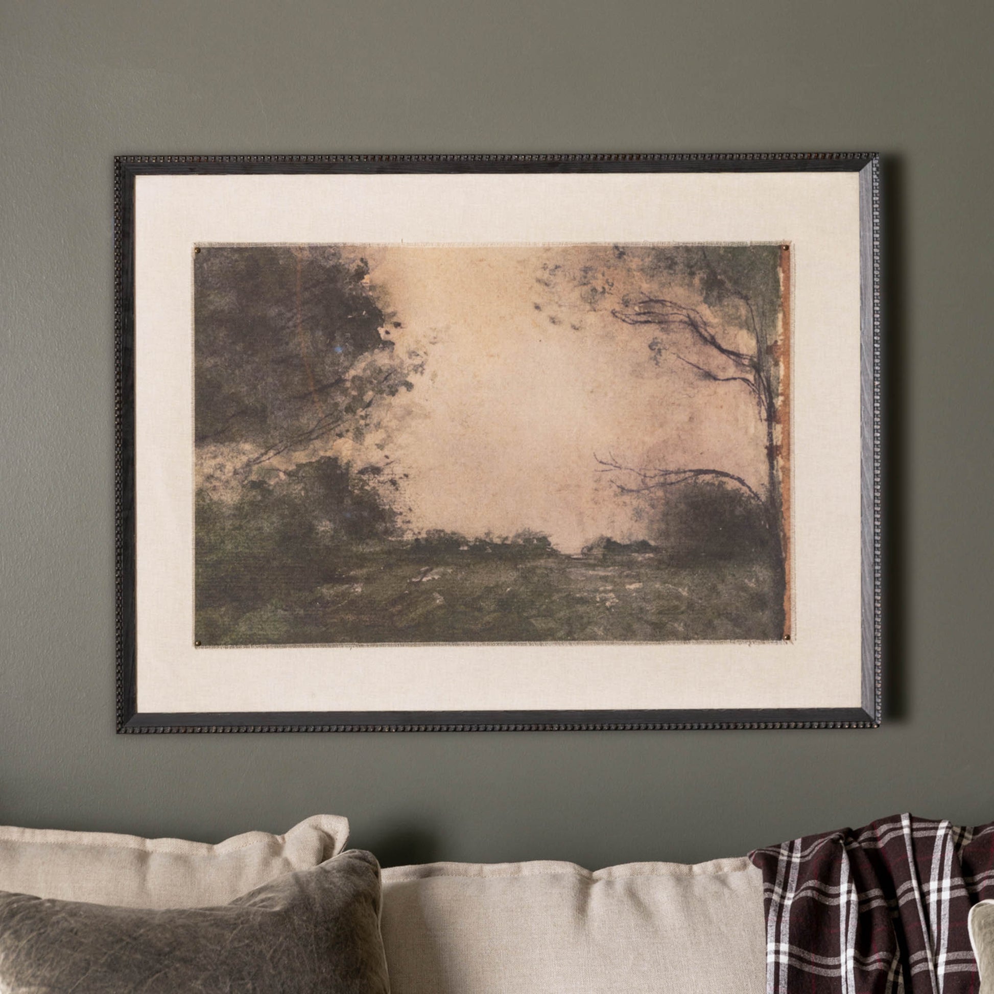 Heirloom IX by Hannah Winters depicts a mysterious landscape with subtle shading and wild foliage. Printed on raw canvas with hand-strung edges and loosely float mounted with pinned corners, this vintage-inspired reproduction is finished with a black frame for added structure and texture. Available in two sizes.