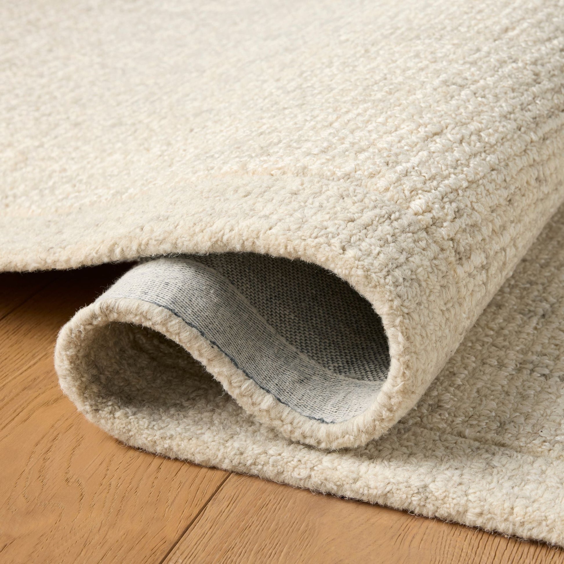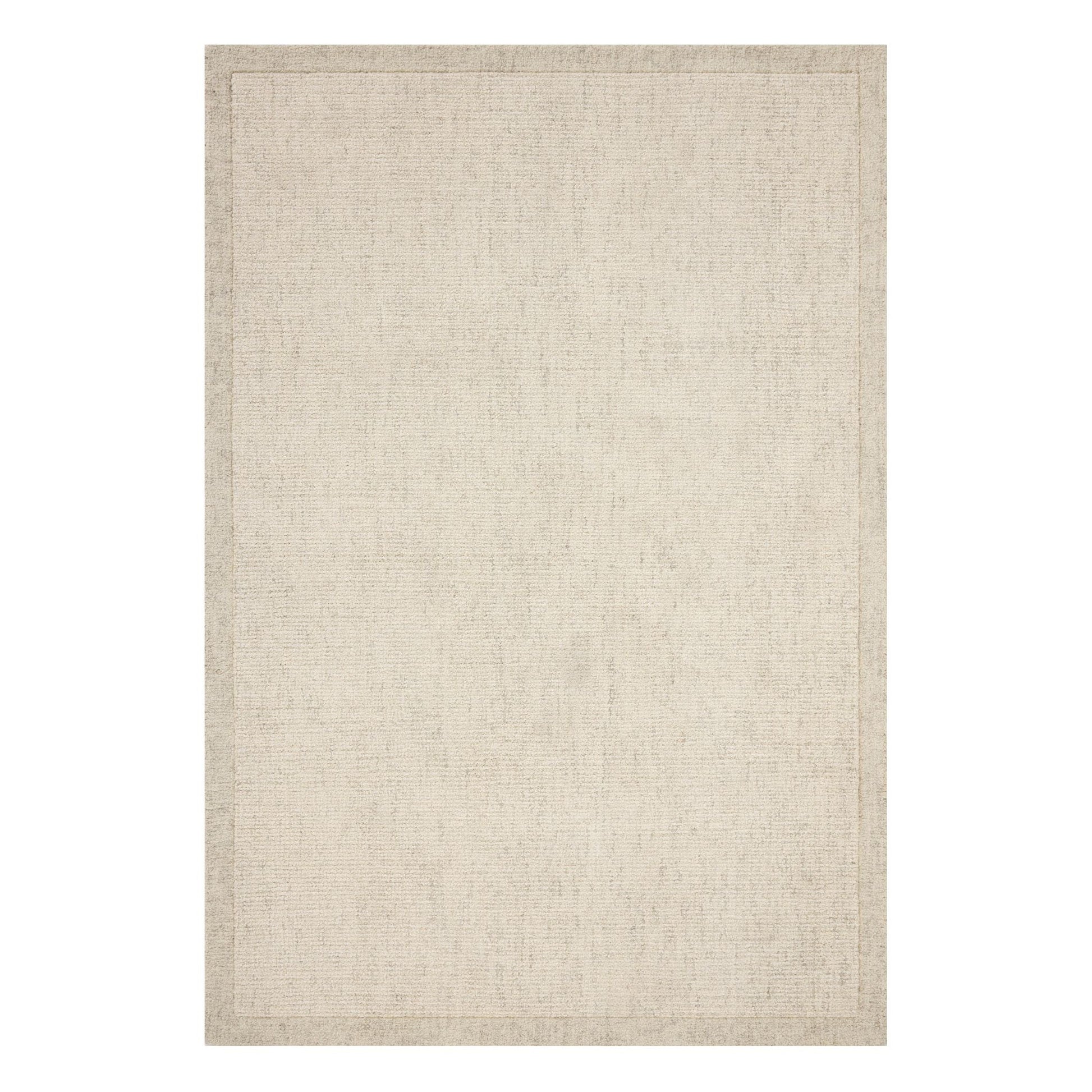 The Henley Ivory Smoke Rug is an elegant area rug with a sturdy hand-tufted pile and framed border; designed by Magnolia Home by Joanna Gaines x Loloi. The heathered neutral-toned color palette adds casual warmth to traditional, farmhouse, or contemporary home decor.