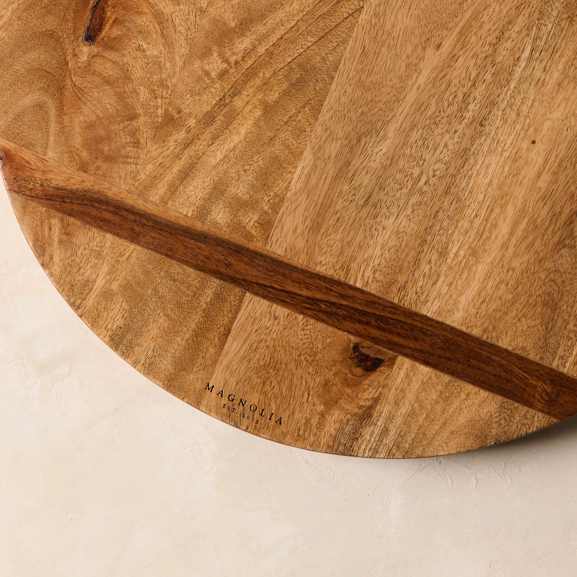 Present charcuterie, freshly sliced bread, or homemade pizza with the striking beauty of the Herringbone Serving Board. Made exclusively for Magnolia and available in two styles, these handled wooden boards feature an eye-catching herringbone pattern that alternates on the reverse side. When not in use, lean them against a backsplash or hang on the wall for a warm, natural display.
