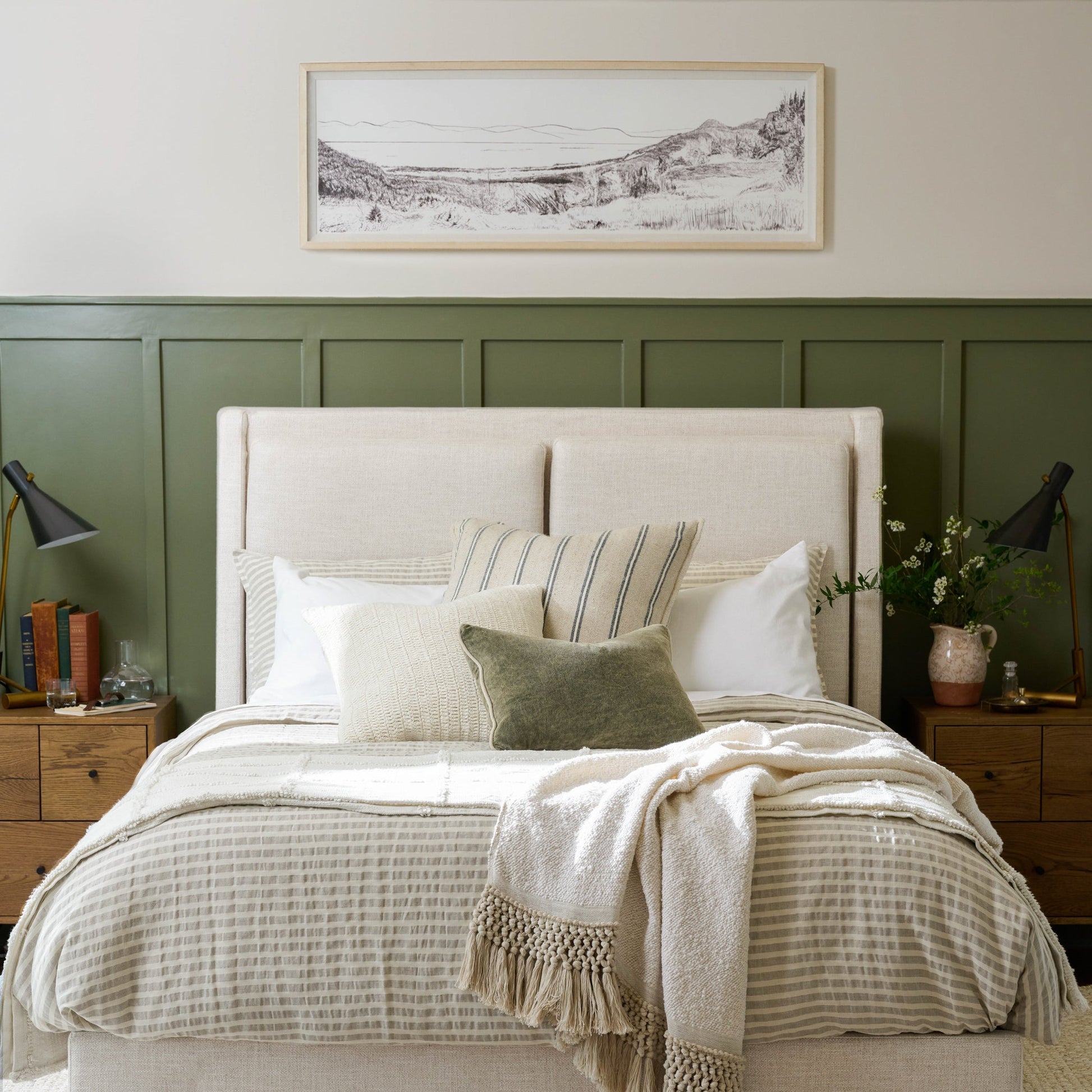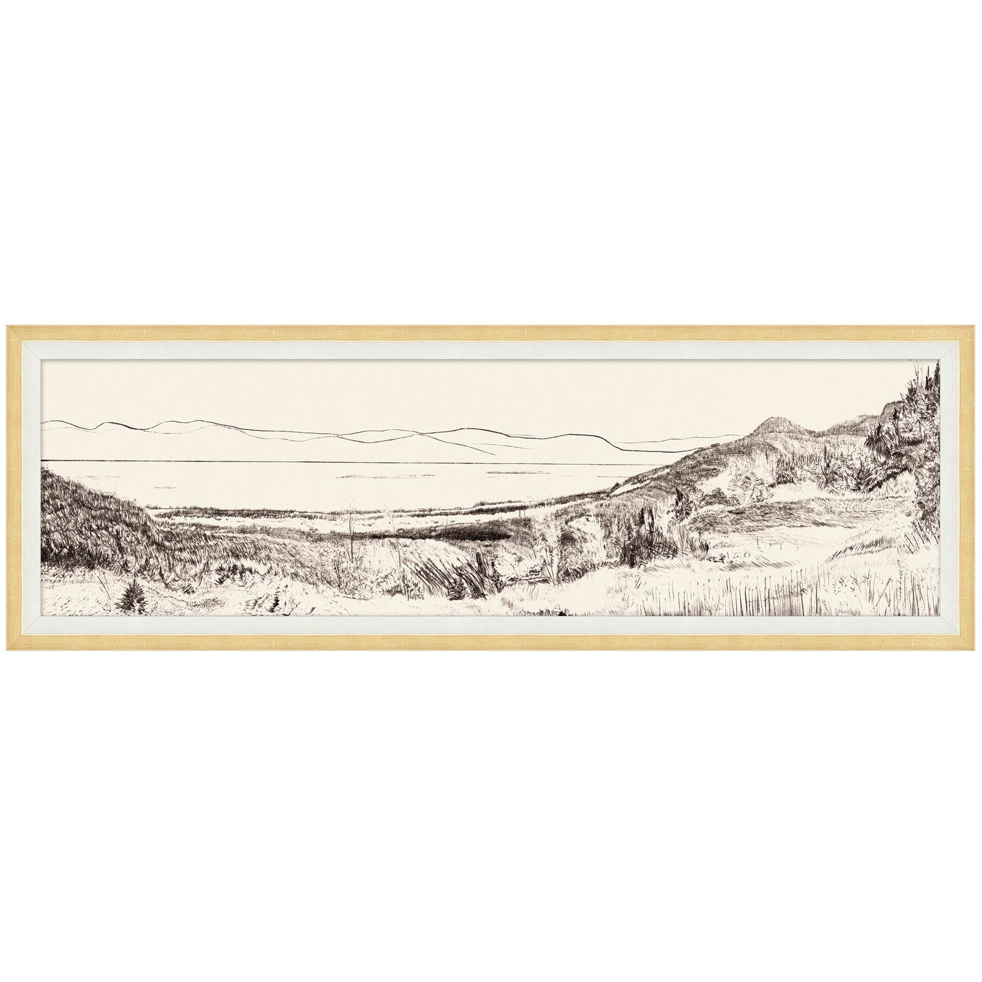 Fine, intricate lines create a sweeping panorama in this oversized landscape. An ivory finish frame with painted wood edges gives this piece a versatile look.