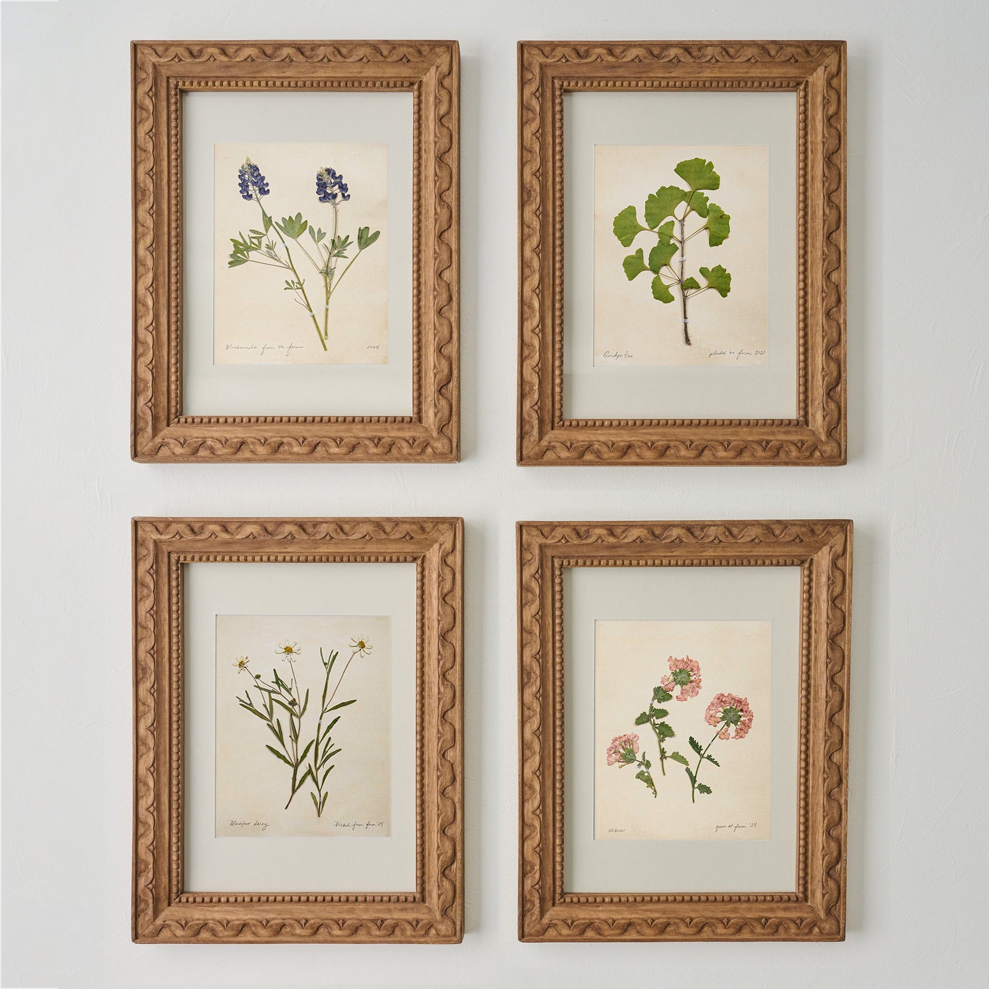 I remember a feeling like relief wash over me, to see these stories living on, to see how something that’s made to bloom then die, to live for only a short while, could actually be pressed to last. And so, once our own garden was alive and growing, the kids and I started a book of our own that we’ve added to every season since. Texas wildflowers, thin white daisies, and our favorite pink verbena fill its pages. One book became two, and now there are heaps of found flowers that fill the shelves of our herbarium at the farm. Some in books, others framed, even more cataloged by species and season. In the act of pressing flowers, we’ve preserved moments and memories from our lives.