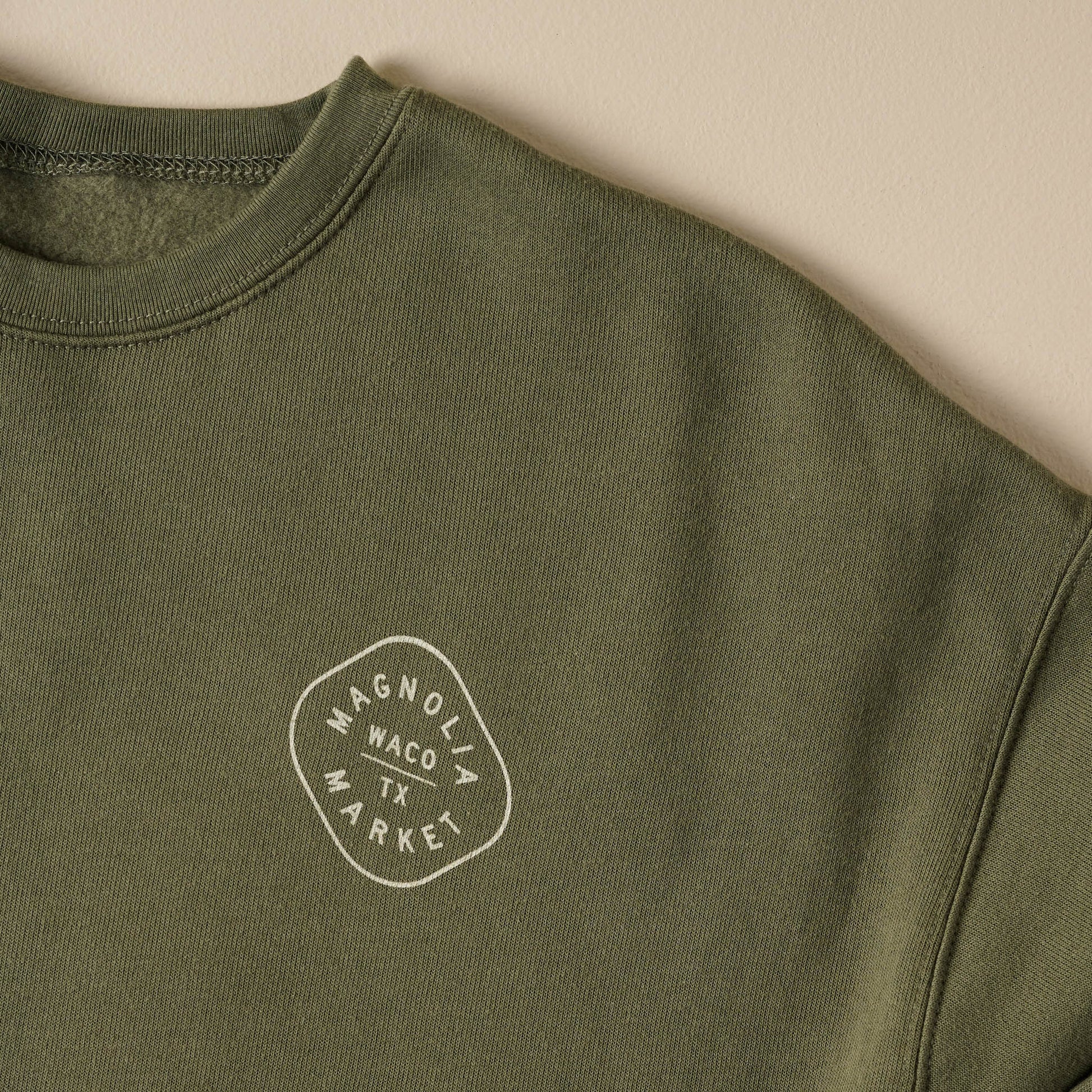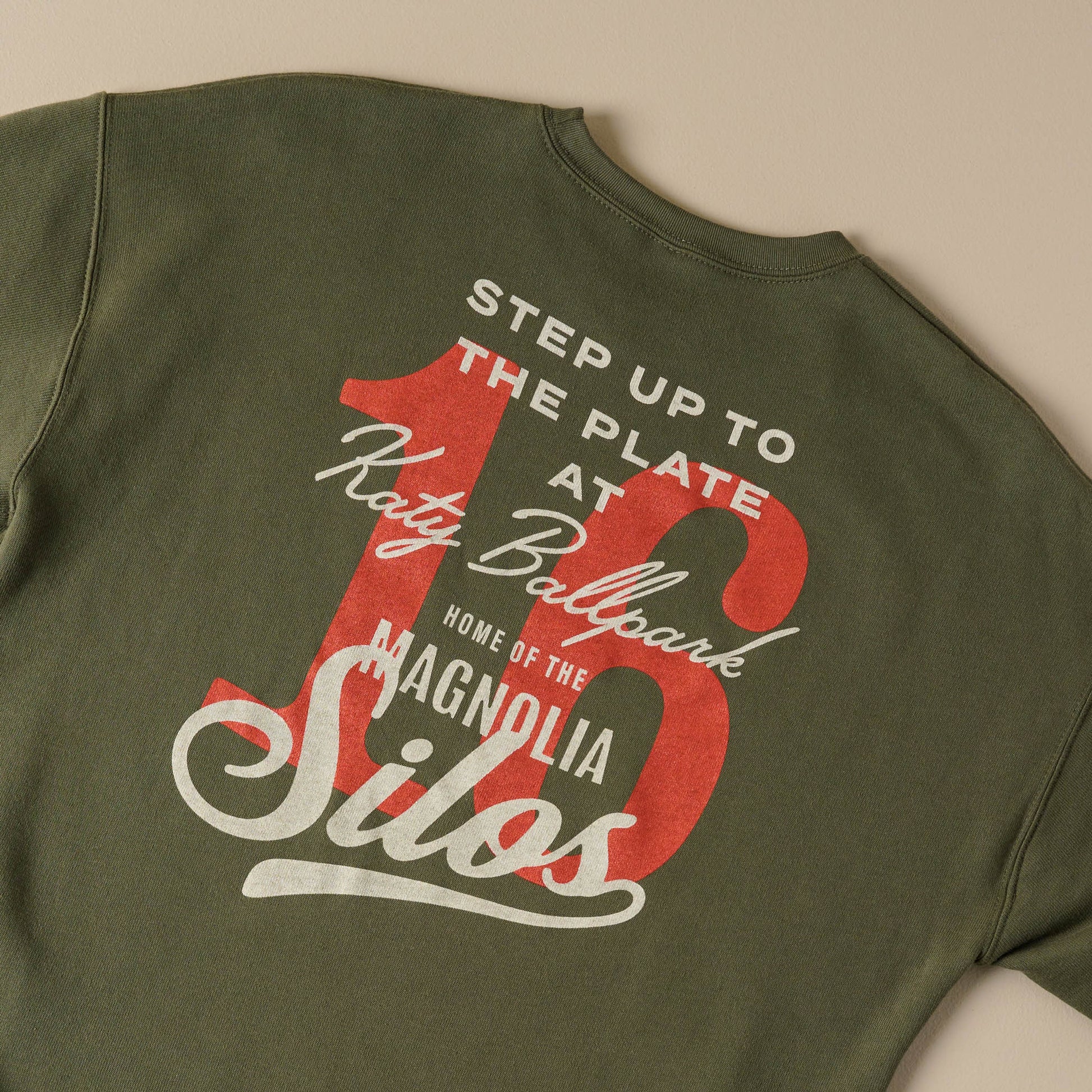 Swing for the fences in our Katy Ballpark Crewneck. Cut from cozy, lightweight fabric, the back of this dark green crew features a red “16” (Chip's baseball jersey number from back in the day!) with text reading: “STEP UP TO THE PLATE AT KATY BALLPARK, HOME OF THE MAGNOLIA SILOS.” The front features a Magnolia Market emblem.