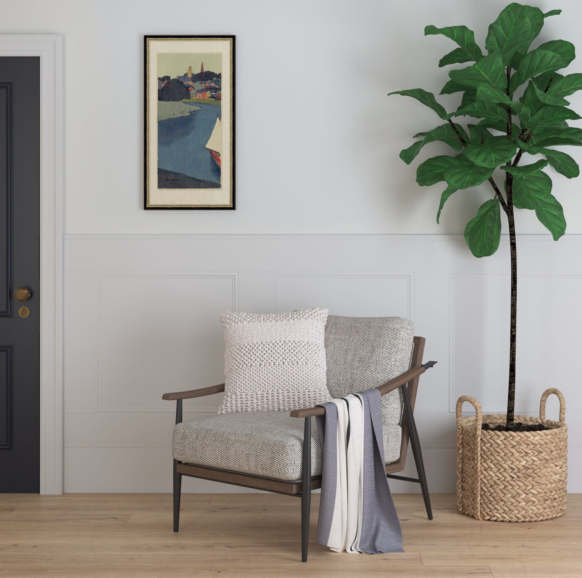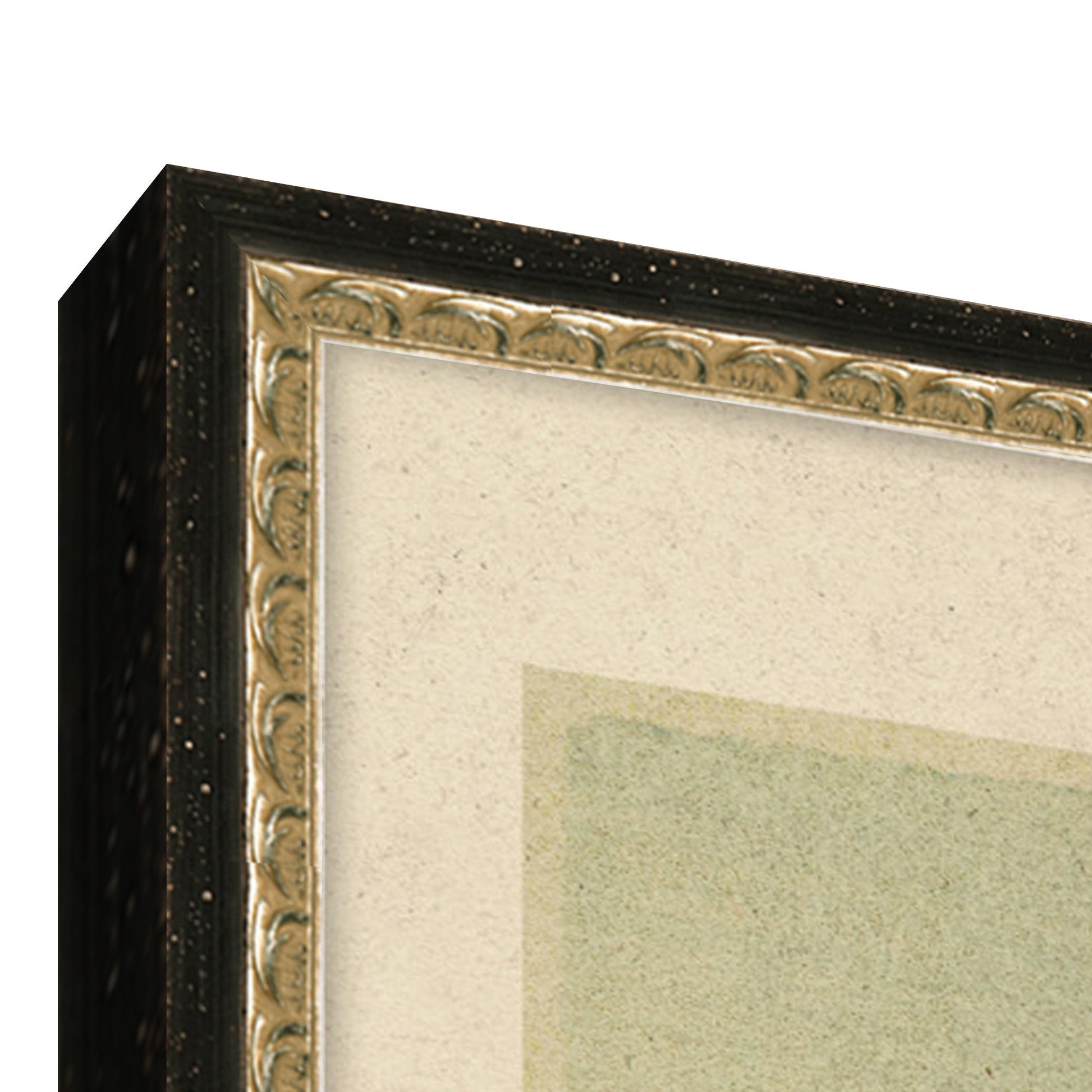Traditional landscape scenes are given a vibrant and unexpected color palette in this wall art collection, Colorful Vignette II featured here. Each vignette features rough, uneven edges and is float mounted against off-white matting and finished with a black and gold frame. Its vertical proportions are ideal for grouping multiples together or for bookending a large piece of furniture.