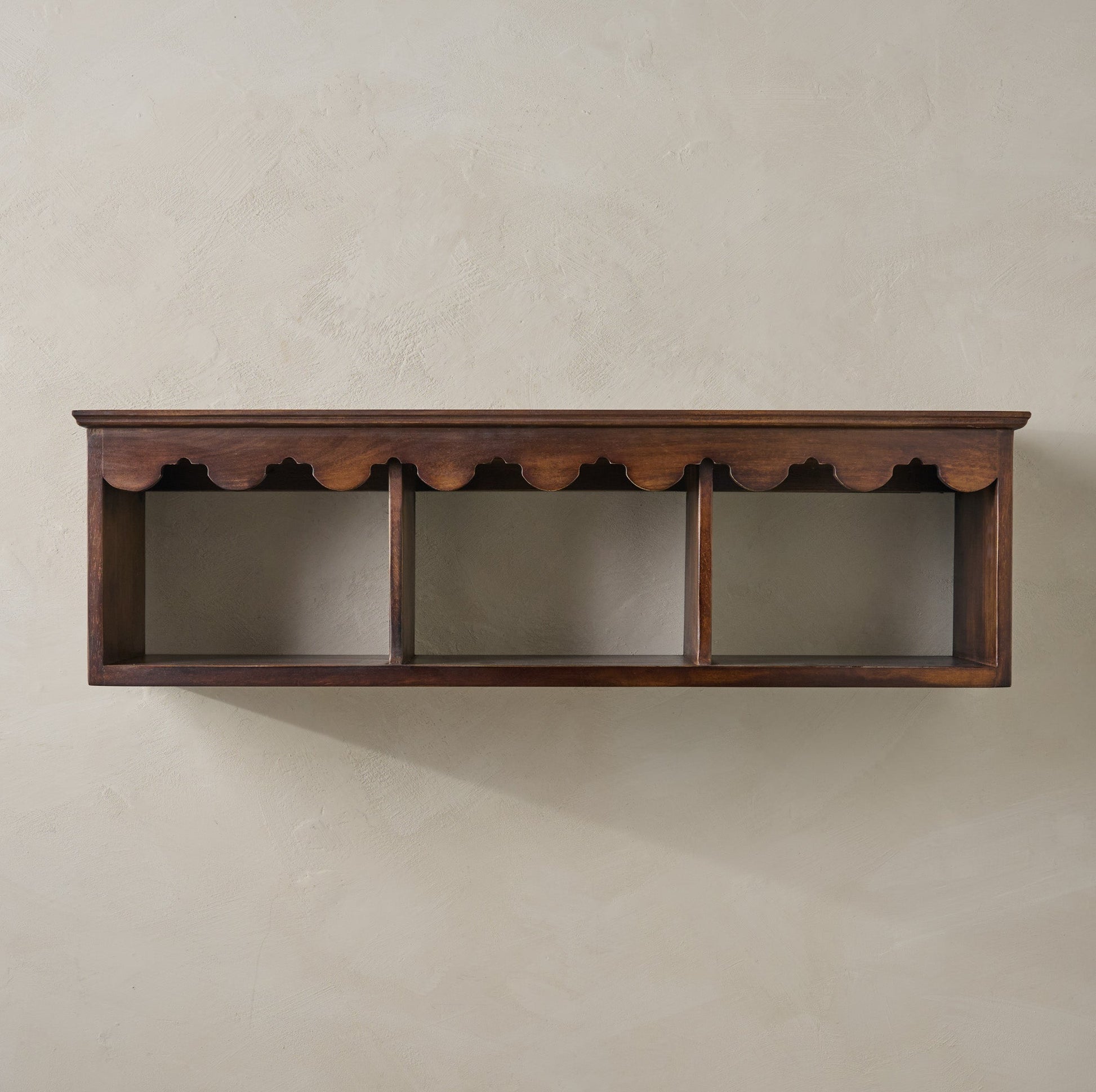 The Linnea Antiqued Wood Cubby Shelf features a charming scalloped trim and three cubby shelves, perfect for displaying decor, organizing kitchen essentials, or keeping small items tidy. Inspired by the popular Linnea Wall Shelf, its antique finish adds a warm, vintage touch to any room.