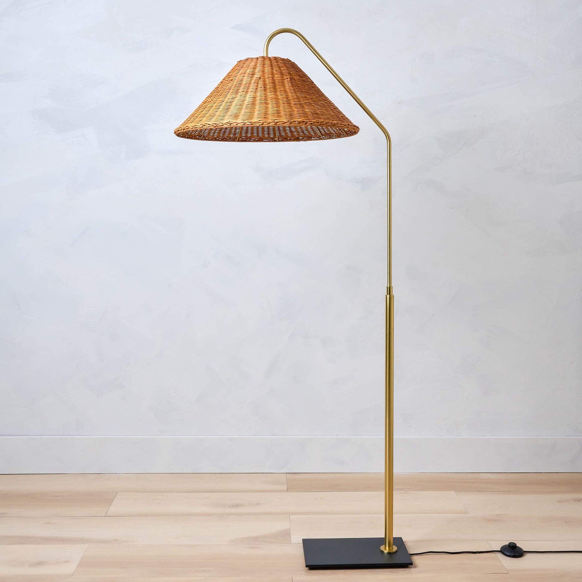 The Lucia Floor Lamp features an adjustable aged brass tube topped with a natural rattan shade that hangs gracefully from an arched neck. Anchored with a textured black base that easily slides beneath a sofa or accent chair, this lamp sheds light on a cozy reading nook with ease.