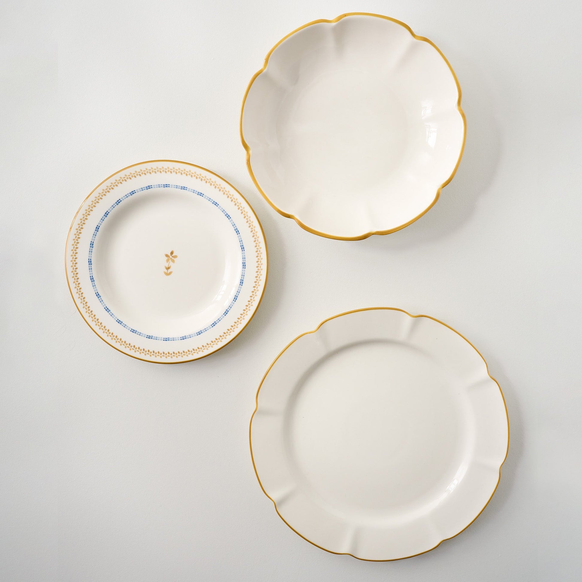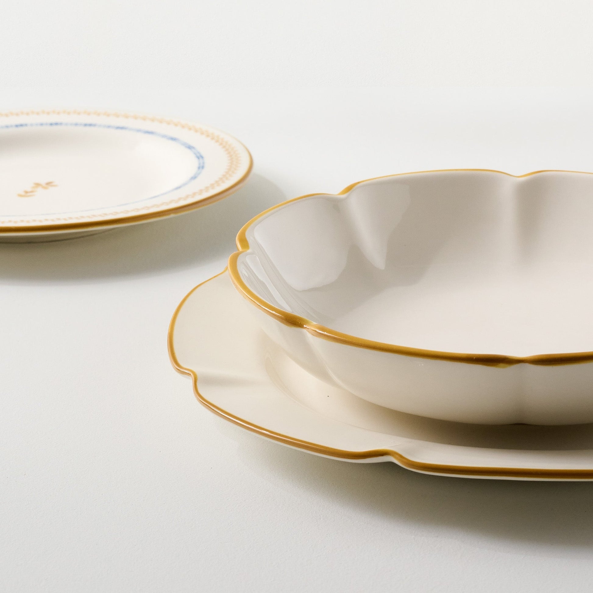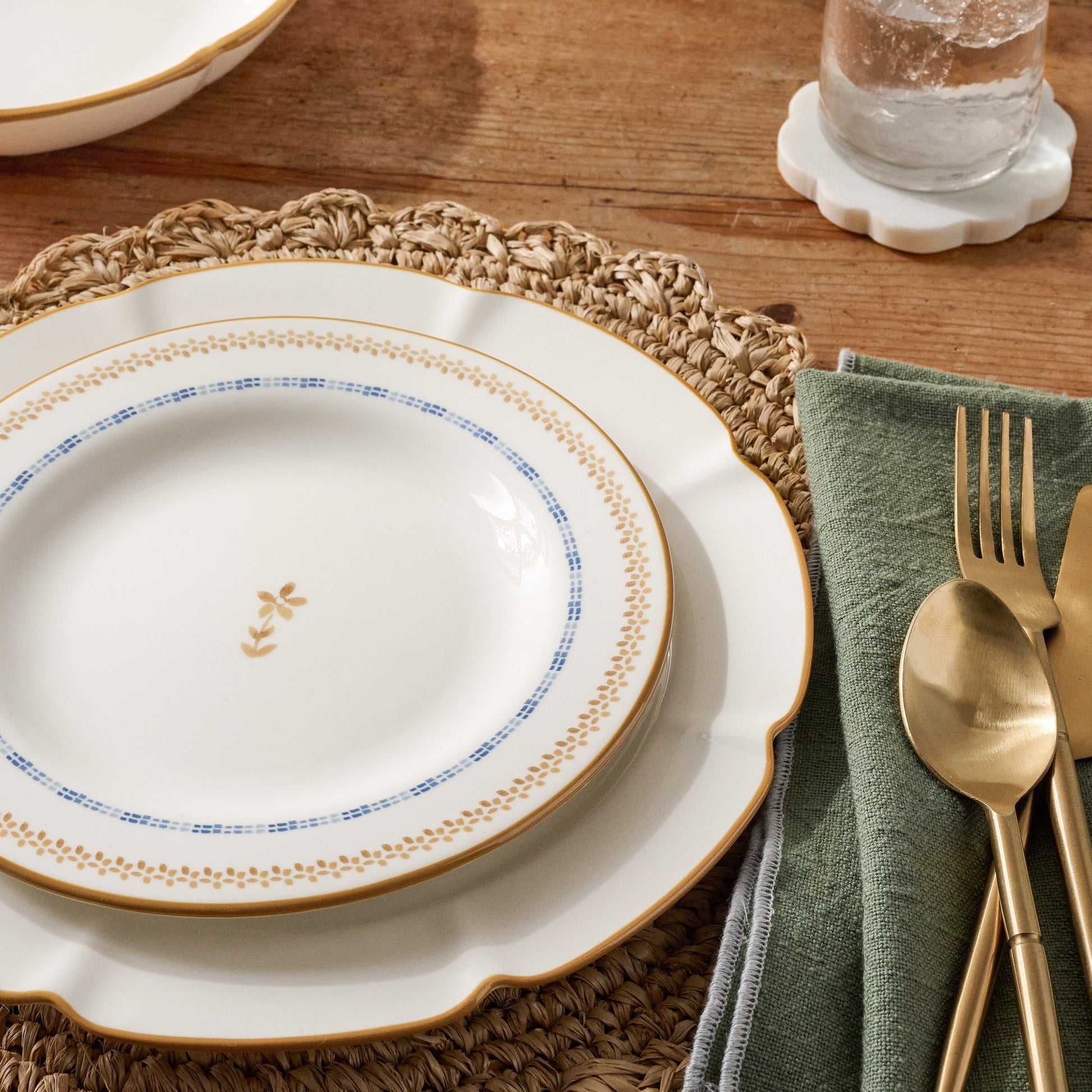 Effortlessly and artfully set the table with the Luna Scalloped Place Setting, complete with a dinner plate, salad plate, and pasta bowl. Crafted from durable, microwave-safe stoneware, the Luna collection features a hand-painted yellow edge, brightening up any hours spent in the dining room. In addition to the dinner plate and pasta bowl's darling scallops, the Luna Floral Salad Plate brings vintage-inspired charm to the table with a beautiful watercolor motif that was originally painted by our in-house artist, then applied to the plate as a decal.