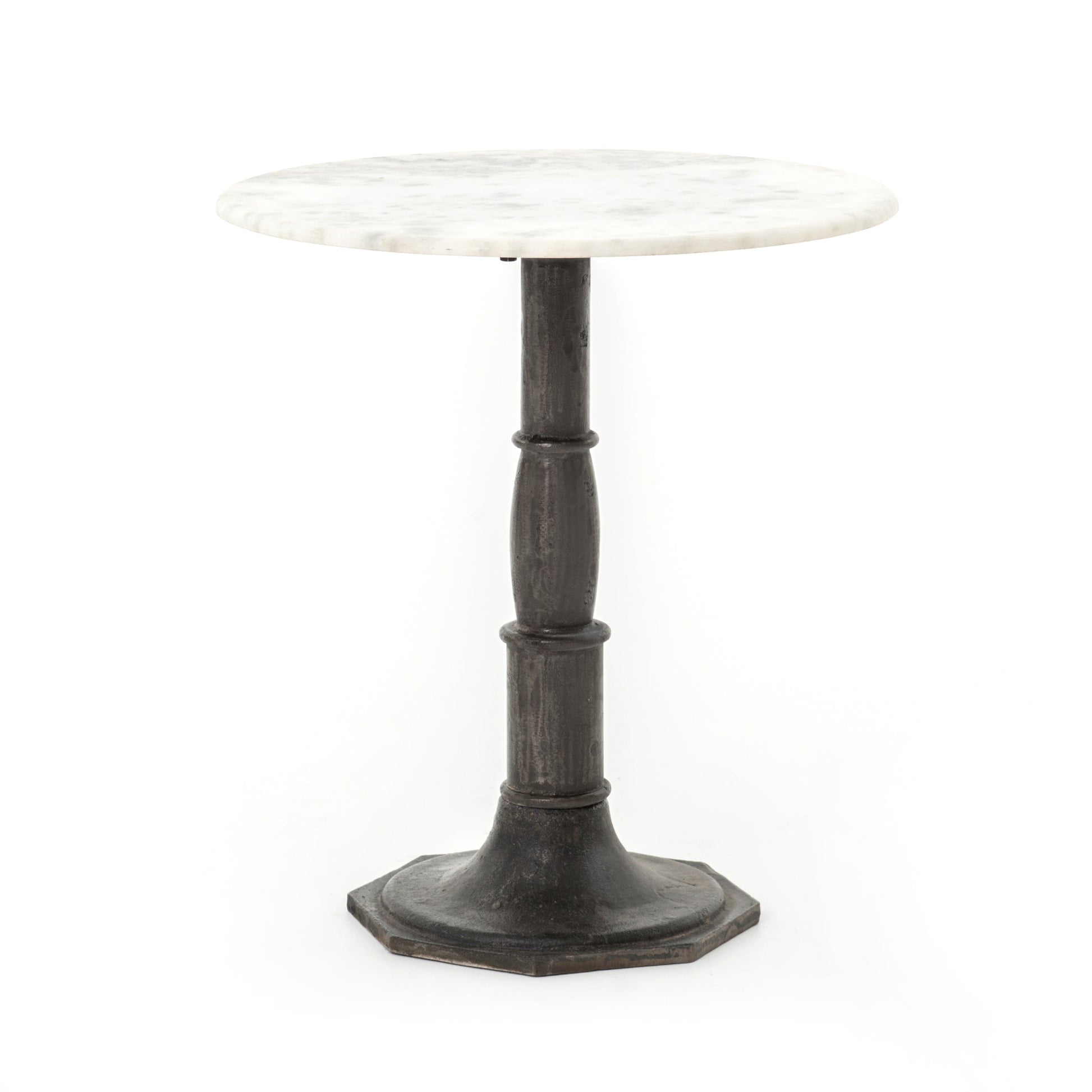 Inspired by French industrial style, the Mae Side Table juxtaposes elegant, white marble with a distressed, carbon-washed iron base.