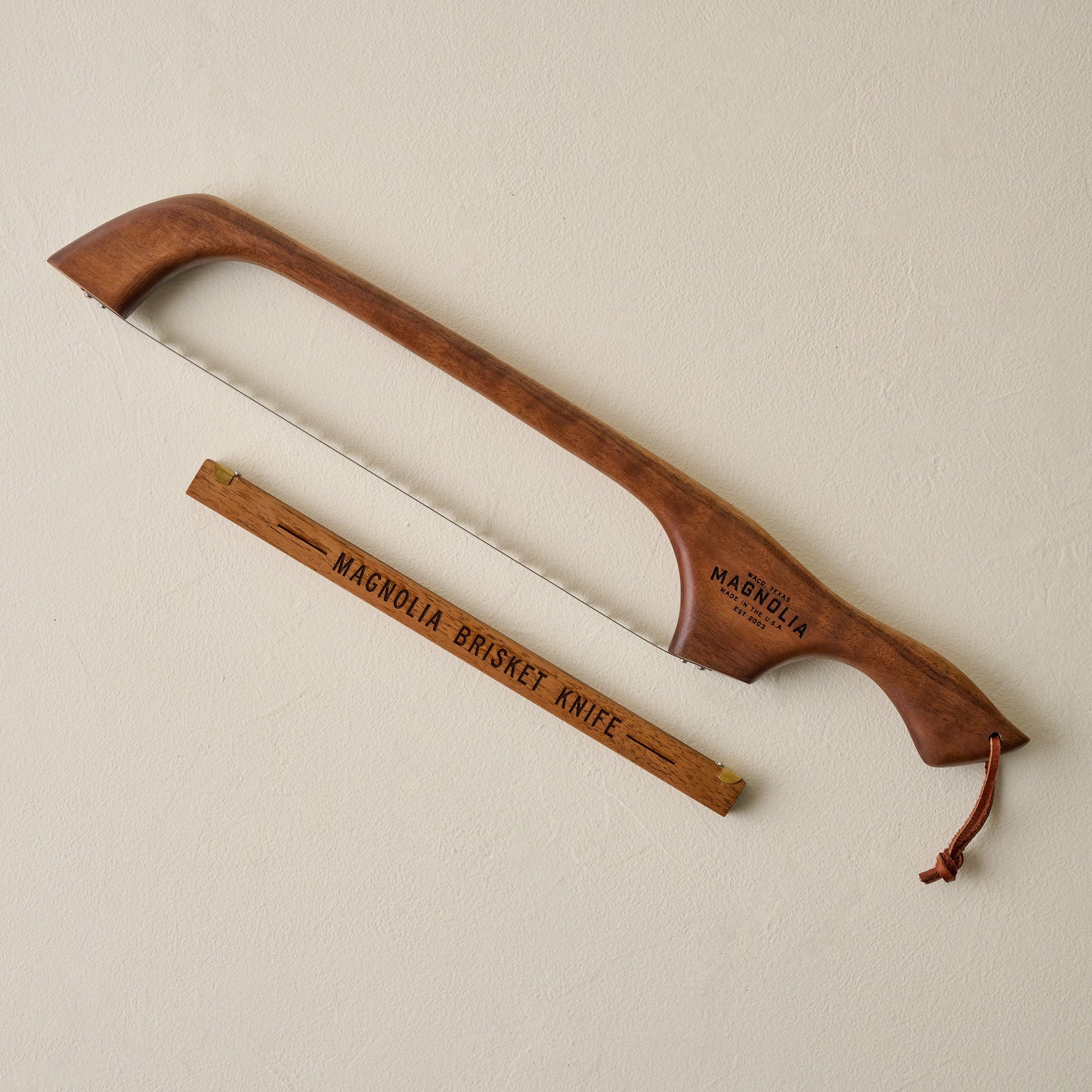 Add a touch of elegance to a beloved American classic cuisine with our Magnolia Brisket Knife by Vintage Maker Studio. Expertly crafted from walnut wood and stainless steel, and finished with a leather strap, this large knife effortlessly slices grilled meats. Wooden sheath included.