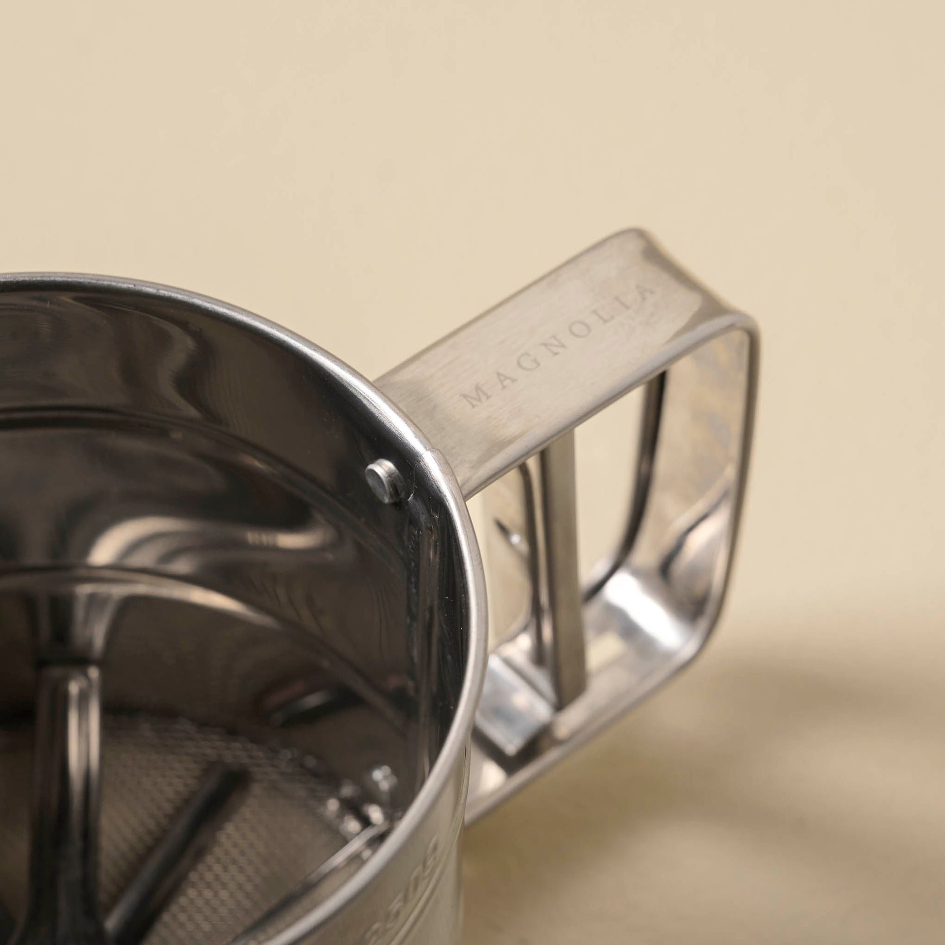 Easily remove clumps and aerate dry ingredients with the convenient squeeze handle of the Magnolia Flour Sifter. Exclusive to Magnolia, this stainless steel sifter allows for one-handed operation, making it easier to achieve light, fluffy results in your baking.