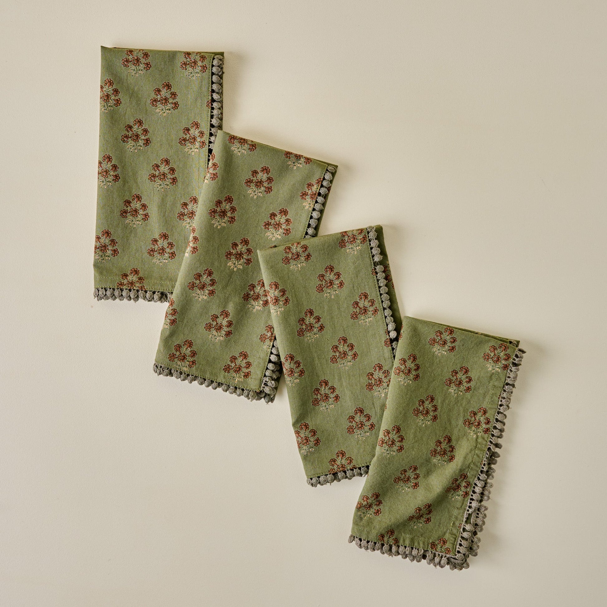 Bring whimsy to your fall tablescape with our Olive Green Napkins Set of Four, featuring a repeating block-printed floral pattern and a textured edge that feels as artisanal as it is practical. Seasonal tones offer warmth, while the darling trim adds a playful touch.