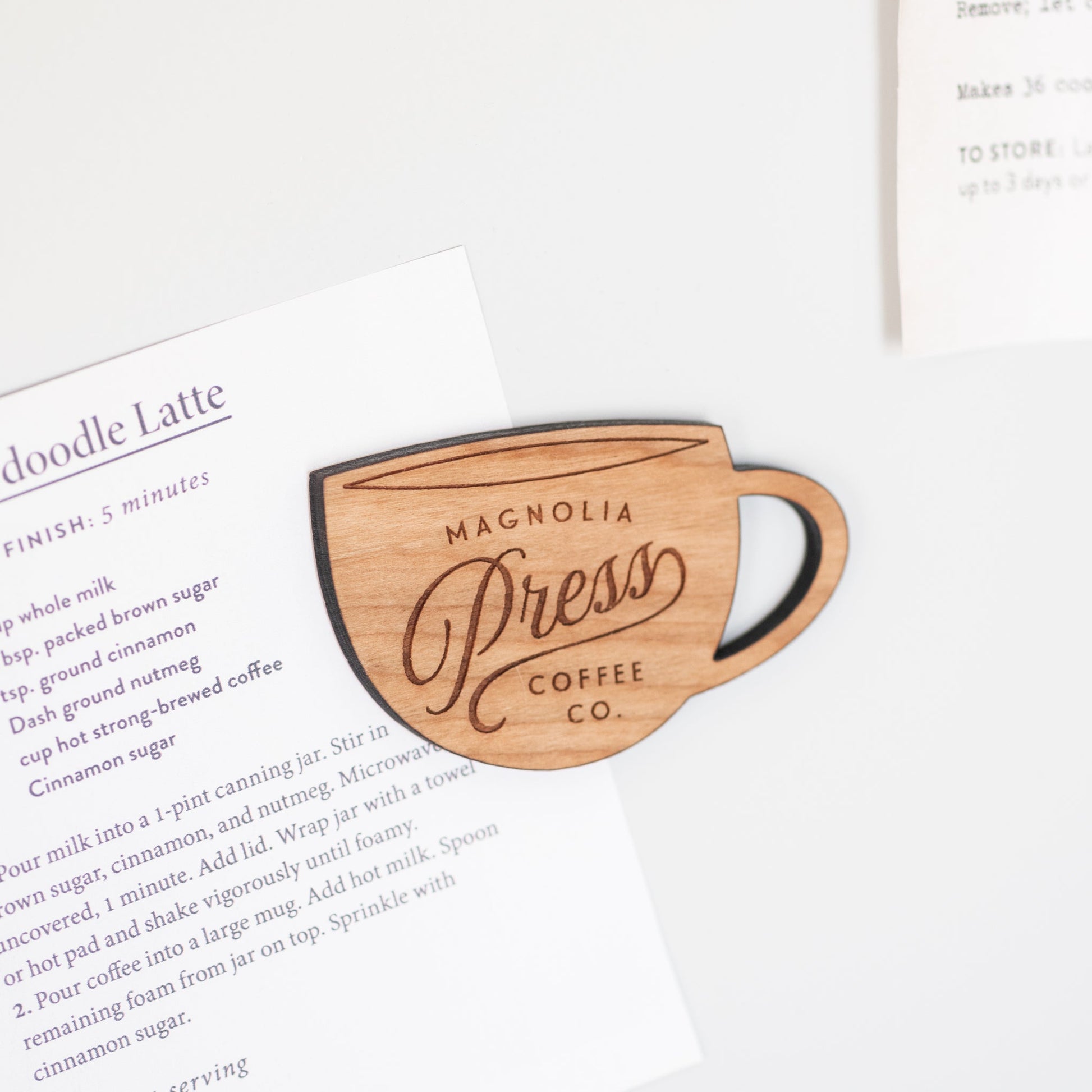 Our Magnolia Press Latte Mug Magnet is reminiscent of the very latte mugs used at our coffee shop in downtown Waco, Texas. This laser-engraved wood magnet is crafted by an American artisan and makes a great gift or can be a fond reminder of your visit.