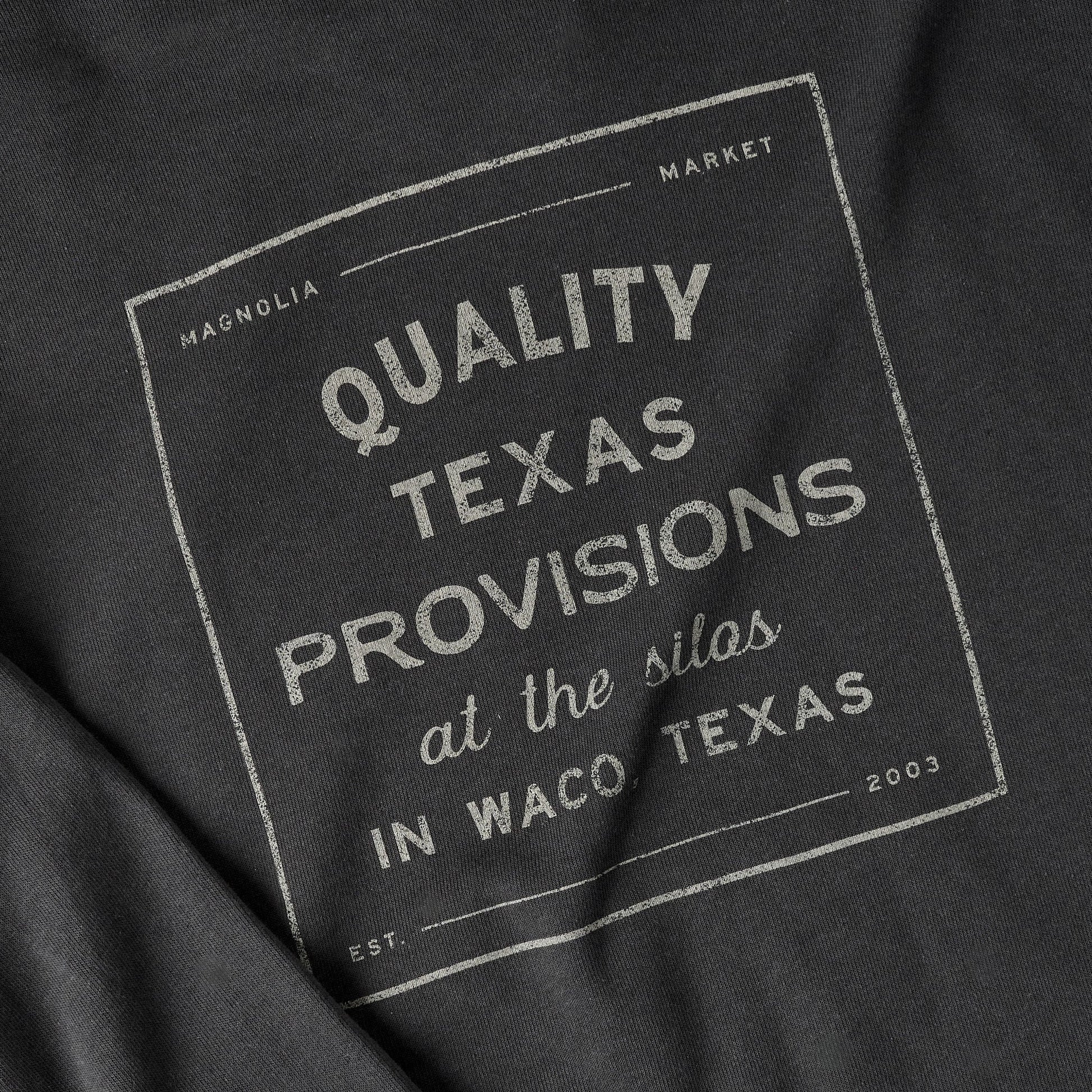 Our exclusive Magnolia Provisions Dark Grey Hoodie is a subtle, staple piece for any closet. Made of a soft, durable grey fabric, the back of this drawstring hoodie is branded with a new design that reads “QUALITY TEXAS PROVISIONS AT THE SILOS IN WACO, TEXAS”.