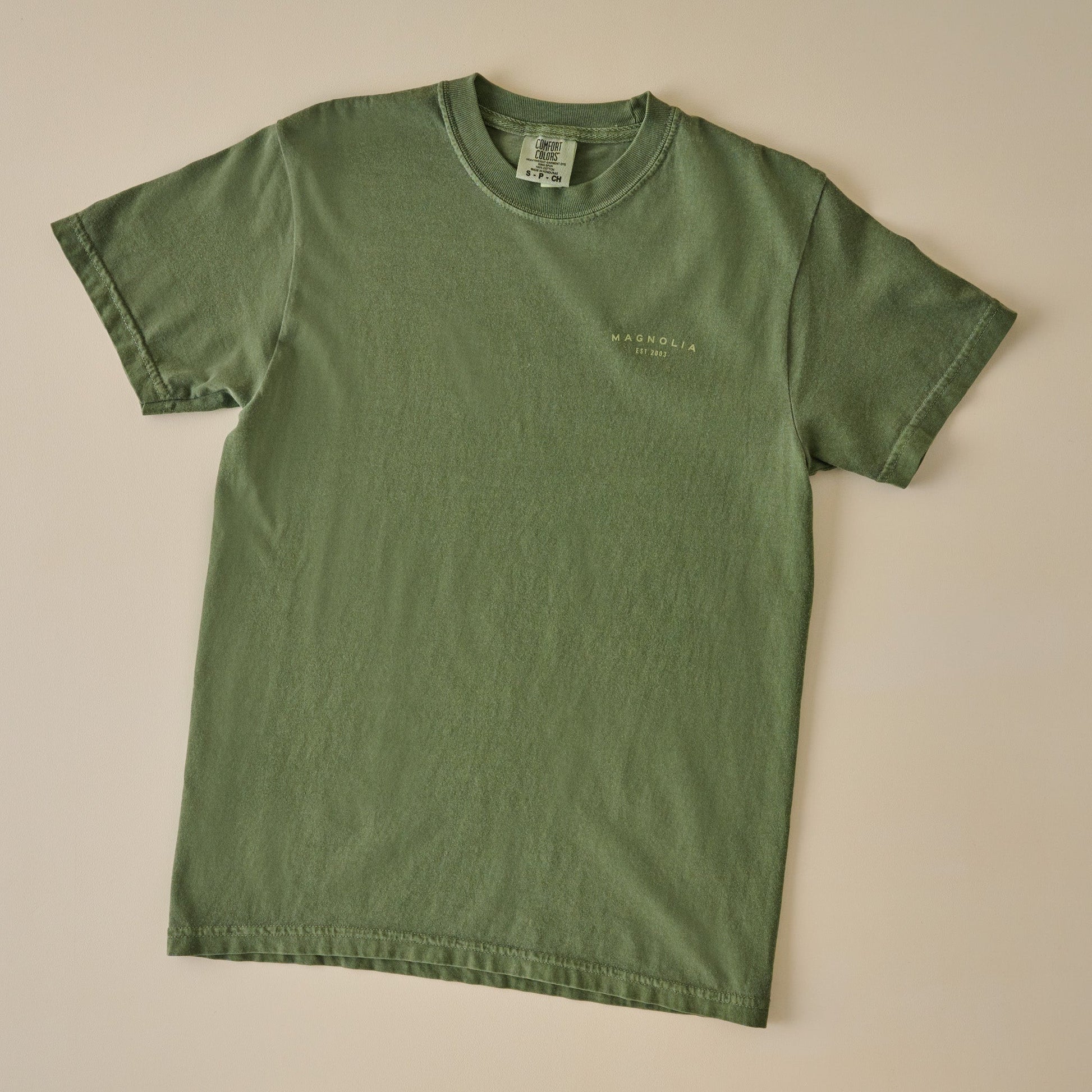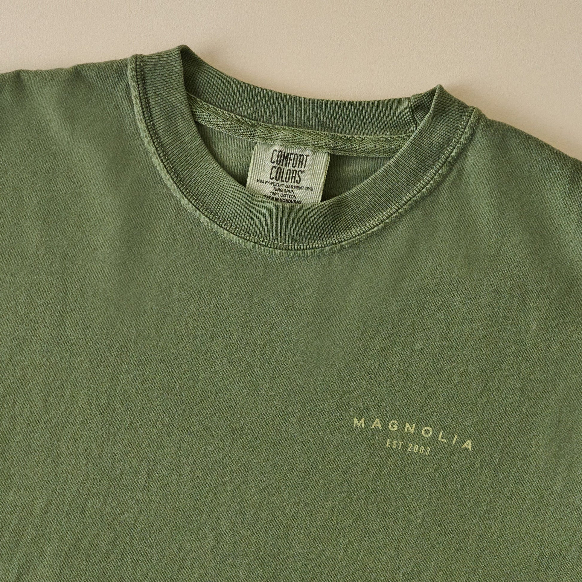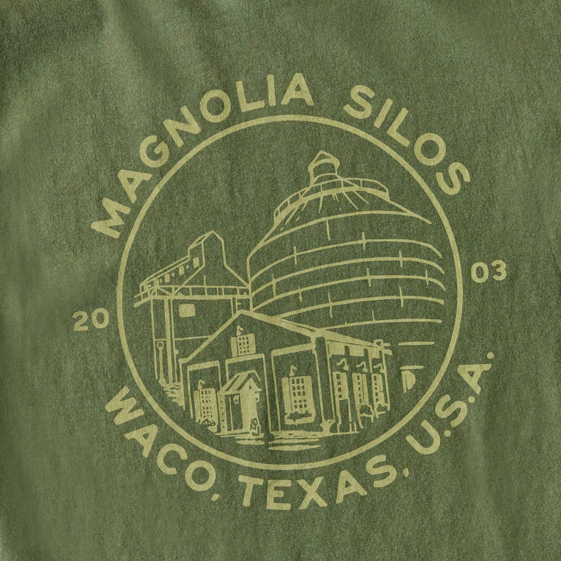 Featuring an artistic illustration of the Silos Baking Co. standing in front of the infamous Silos and Magnolia Market, the Magnolia Silos Crest Green Shirt is a sweet reminder of a visit to our grounds. Made of 100% cotton, this tee suits both men and women and includes a front logo reading, “Magnolia | Est. 2003."