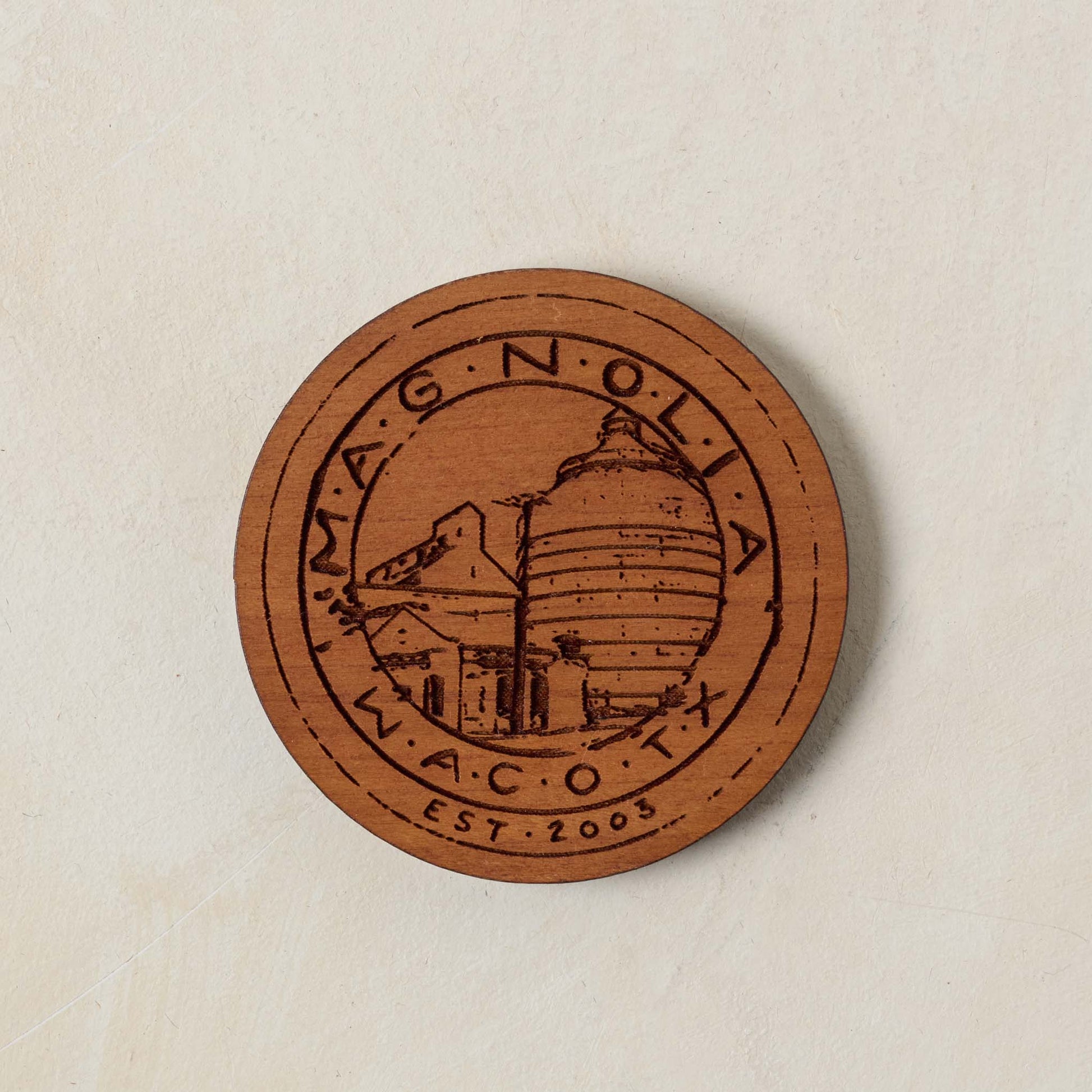 Secure your cherished photos on the fridge with our Magnolia Silos Seal Magnet. This signature keepsake is made of laser-engraved wood by an American artisan.