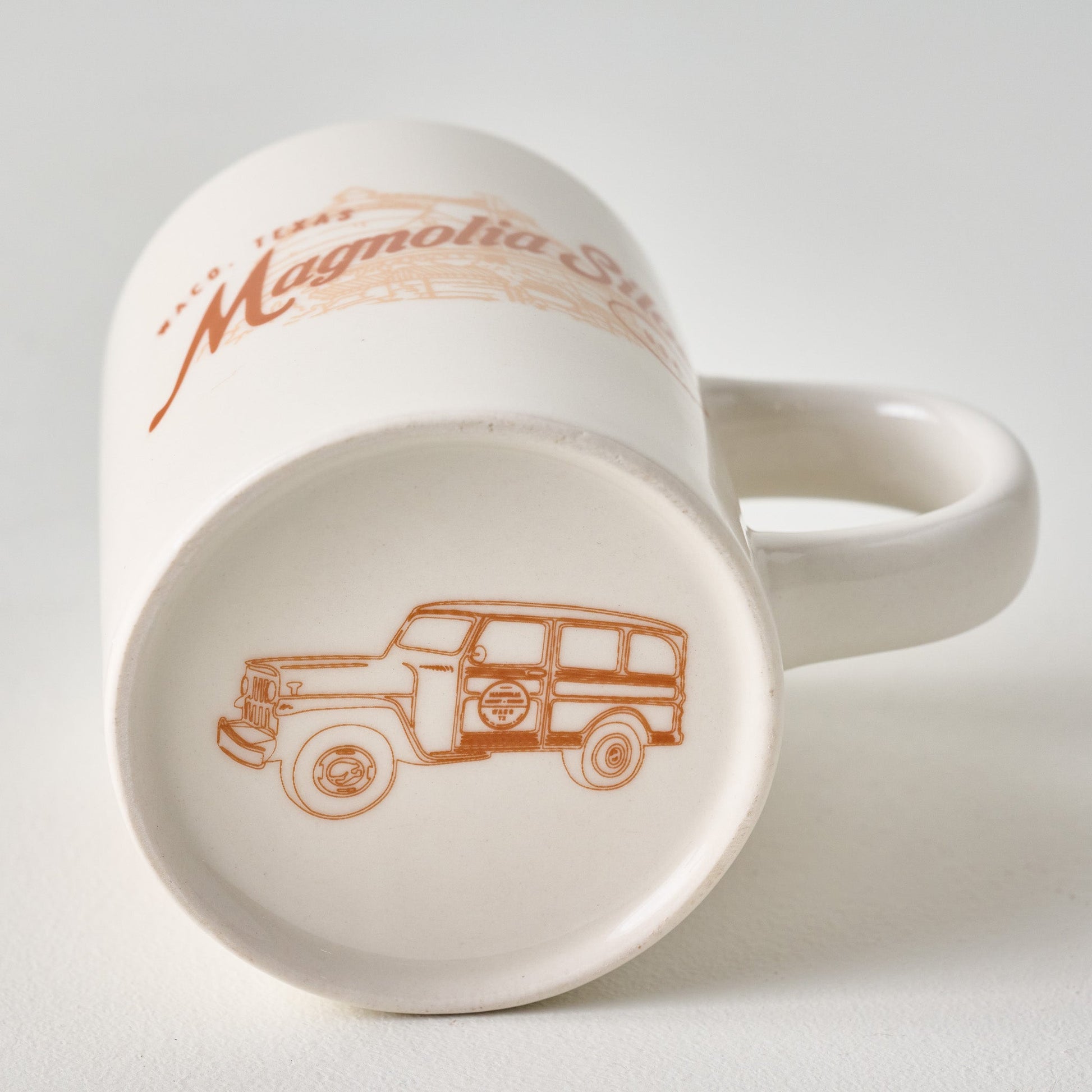 Exuding vintage charm and a classic silhouette, this cozy mug features a darling depiction of the Magnolia Silos on the front, complemented by bold lettering in a rustic orange hue. As you tip the mug to take a sip, an image of the iconic truck that welcomes guests to the grounds is revealed, adding a delightful surprise to your morning coffee.