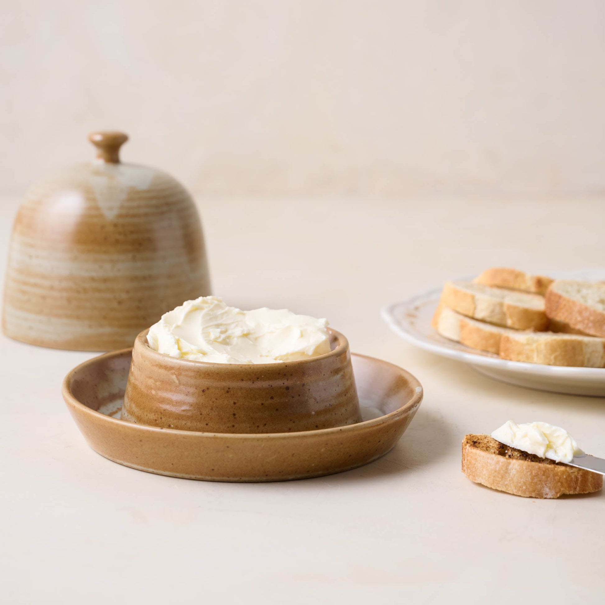 Designed in-house and forged with a reactive glaze and reduction firing—a process where oxygen is drawn out of the glaze and clay to create rich, earthy tones—this butter dish keeps butter soft and spreadable. A rimmed tray and dome-top lid bring artisan-appeal to the kitchen counter stylish while keeping contents fresh.