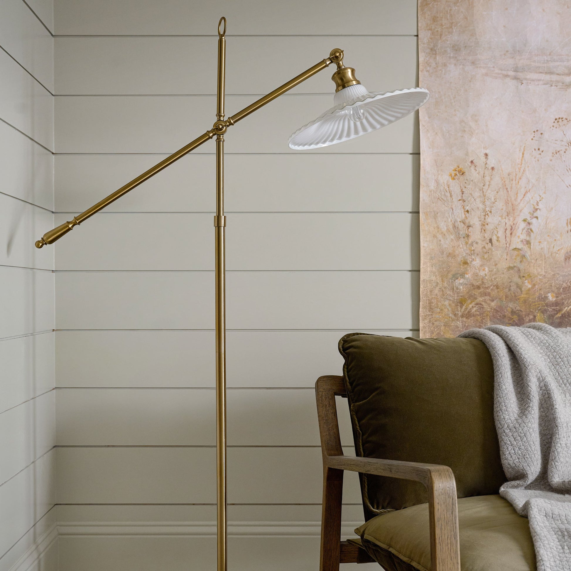 Featuring a solid metal base and a stunning slanted arm in a brass-like finish, our Marjorie Floor Lamp lends streamlined elegance to any room. It’s topped with an opaque, milky shade made of frosted glass. Exclusive to Magnolia.