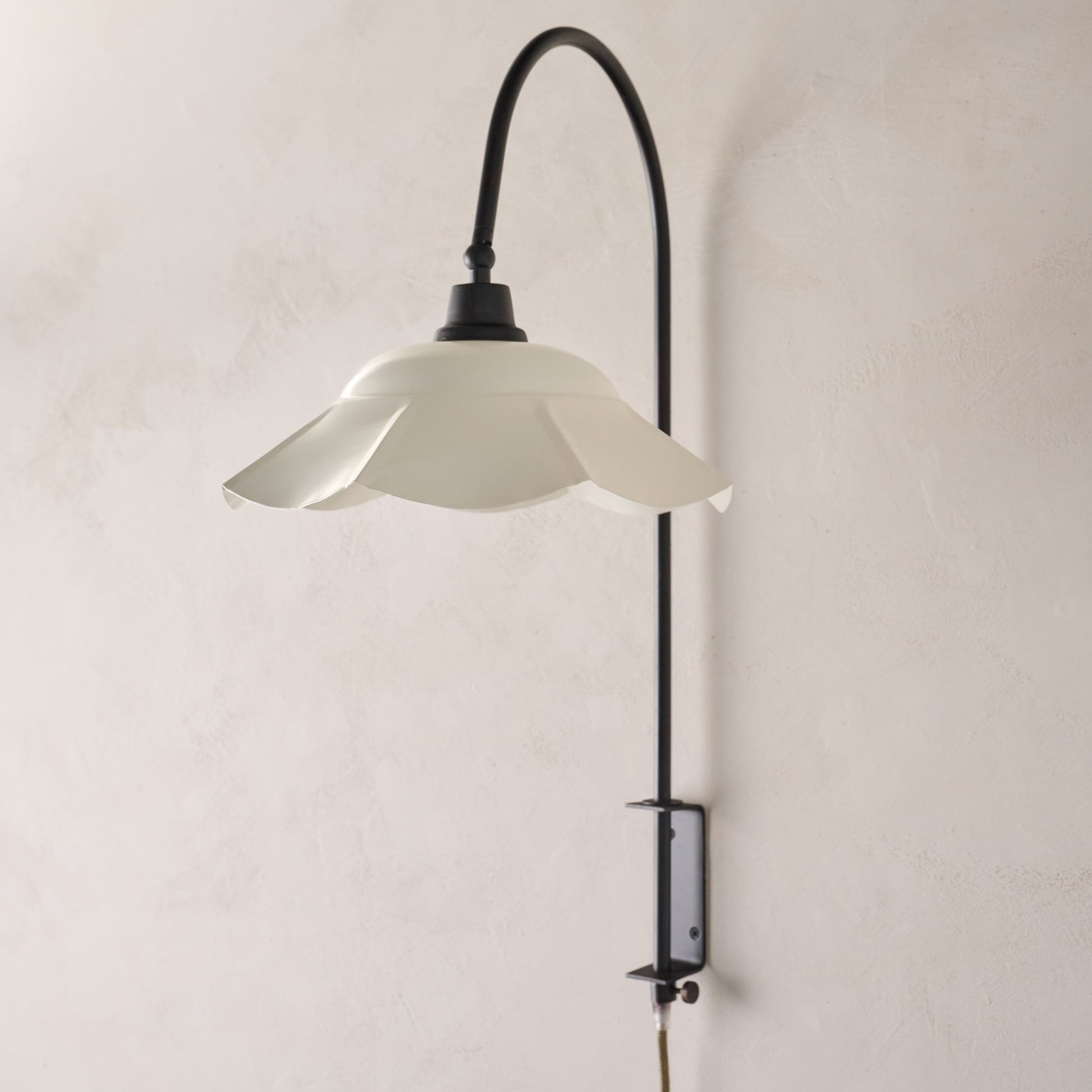Exclusive to Magnolia, this plug-in sconce features an antique-brass finish and metal shade with softly ruffled detailing. The adjustable arched bracket adds function and architectural interest to any wall. The power switch is located on the cord. Available in two shade colors.