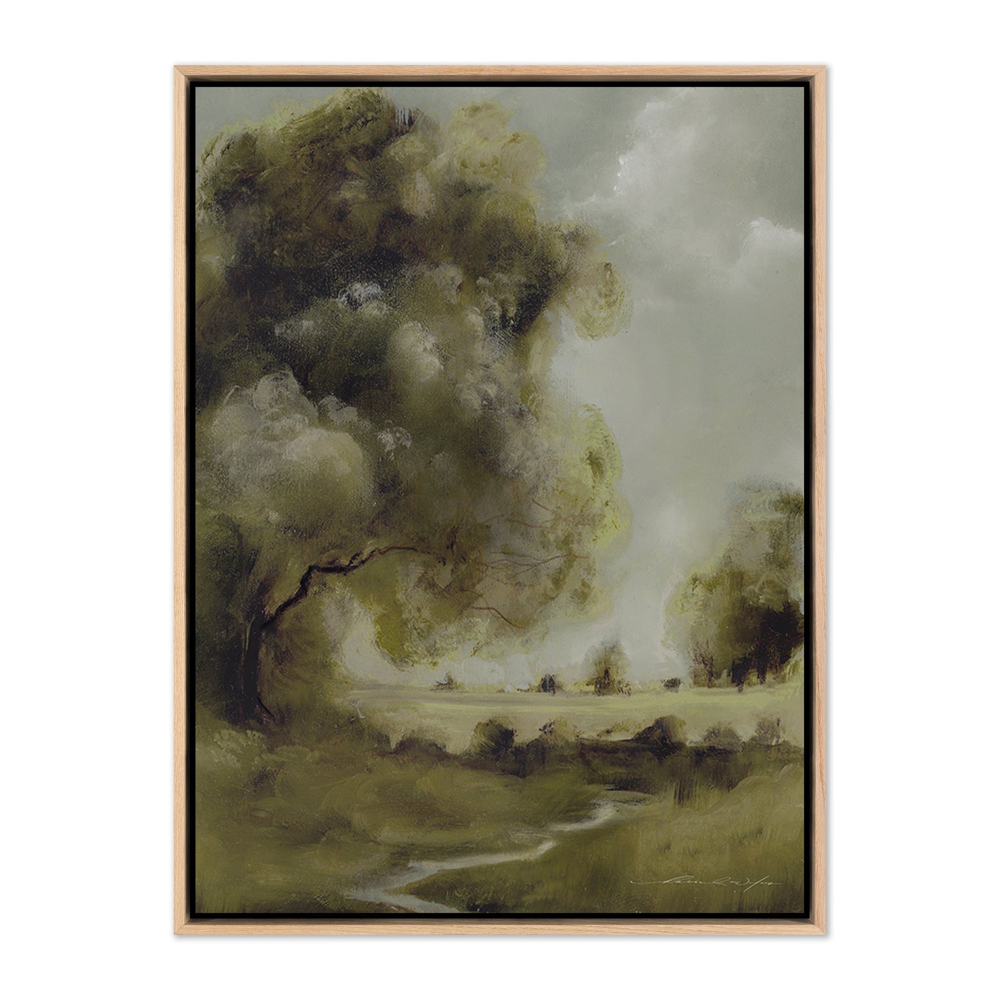 Inspired by a still and safe place of meeting, Meet Me There by Hannah Winters depicts lush green hills and overcast skies on a canvas floater frame bordered in vertical grain white oak. Available in two sizes, this framed canvas art will be a perfect addition to any room.
