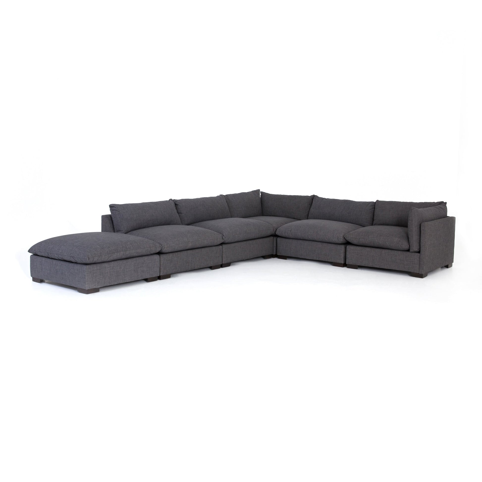 Featuring clean lines, a low profile, and knife edge cushioning upholstered in easy-to-clean high performance fabric, the Monroe 5 Piece Sectional with Ottoman is a stylish lounger the whole family can enjoy. Various configurations offer flexibility to fit your space. Available in two colors.